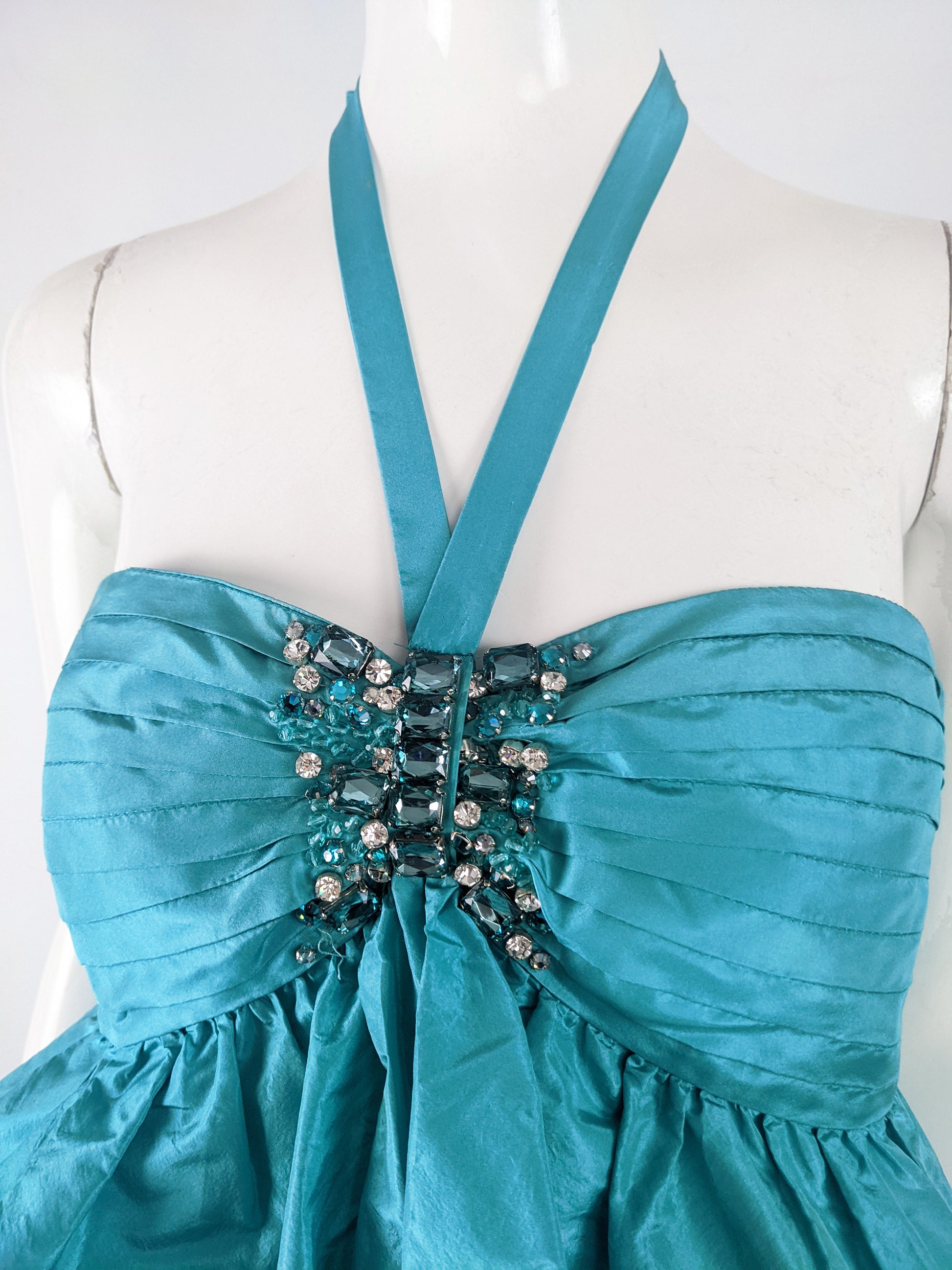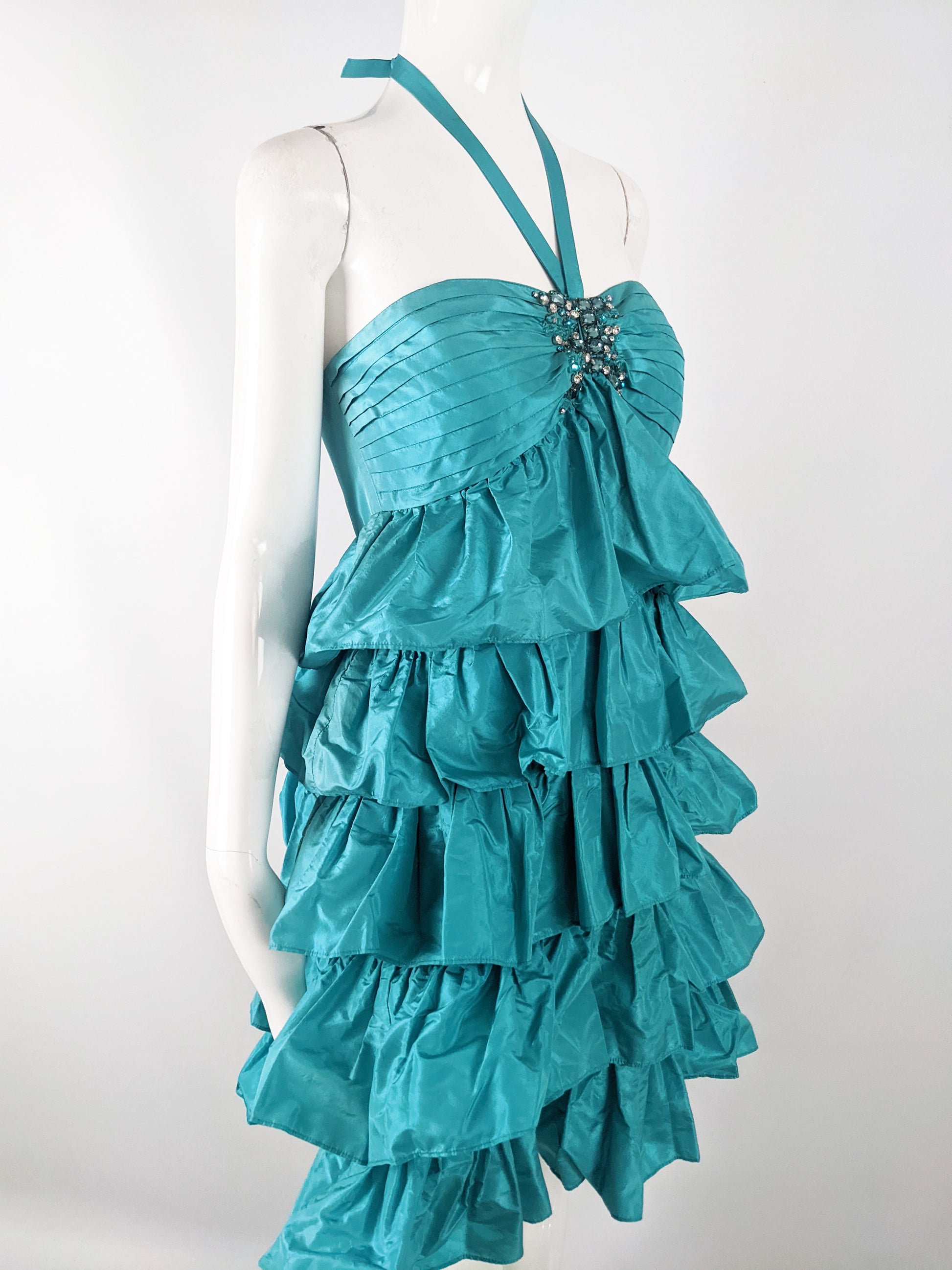 An incredible vintage y2k womens party dress from the early 2000s by luxury Italian fashion house, Blumarine for the Blugirl line. Made in Italy from a teal silk taffeta with a fitted bust, a faux gem beaded halter neck and incredible flounced tiers. It still has tags attached with the original RRP being £749.99 in the 2000s.