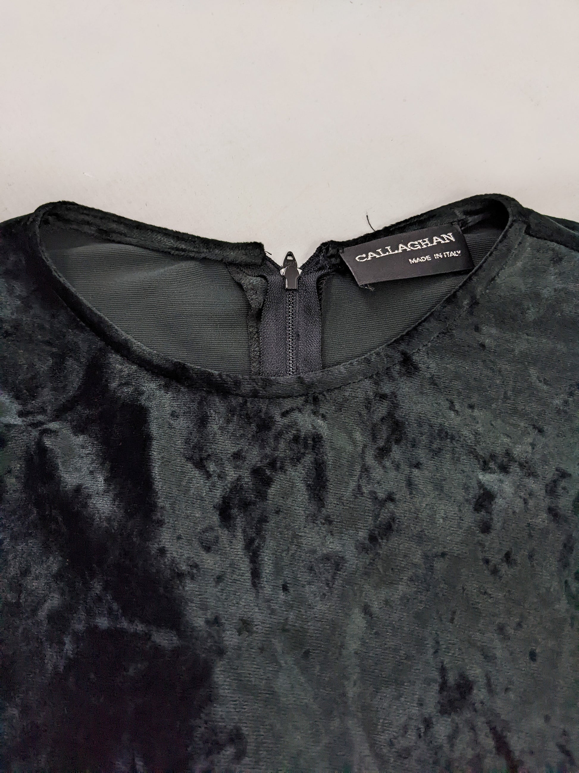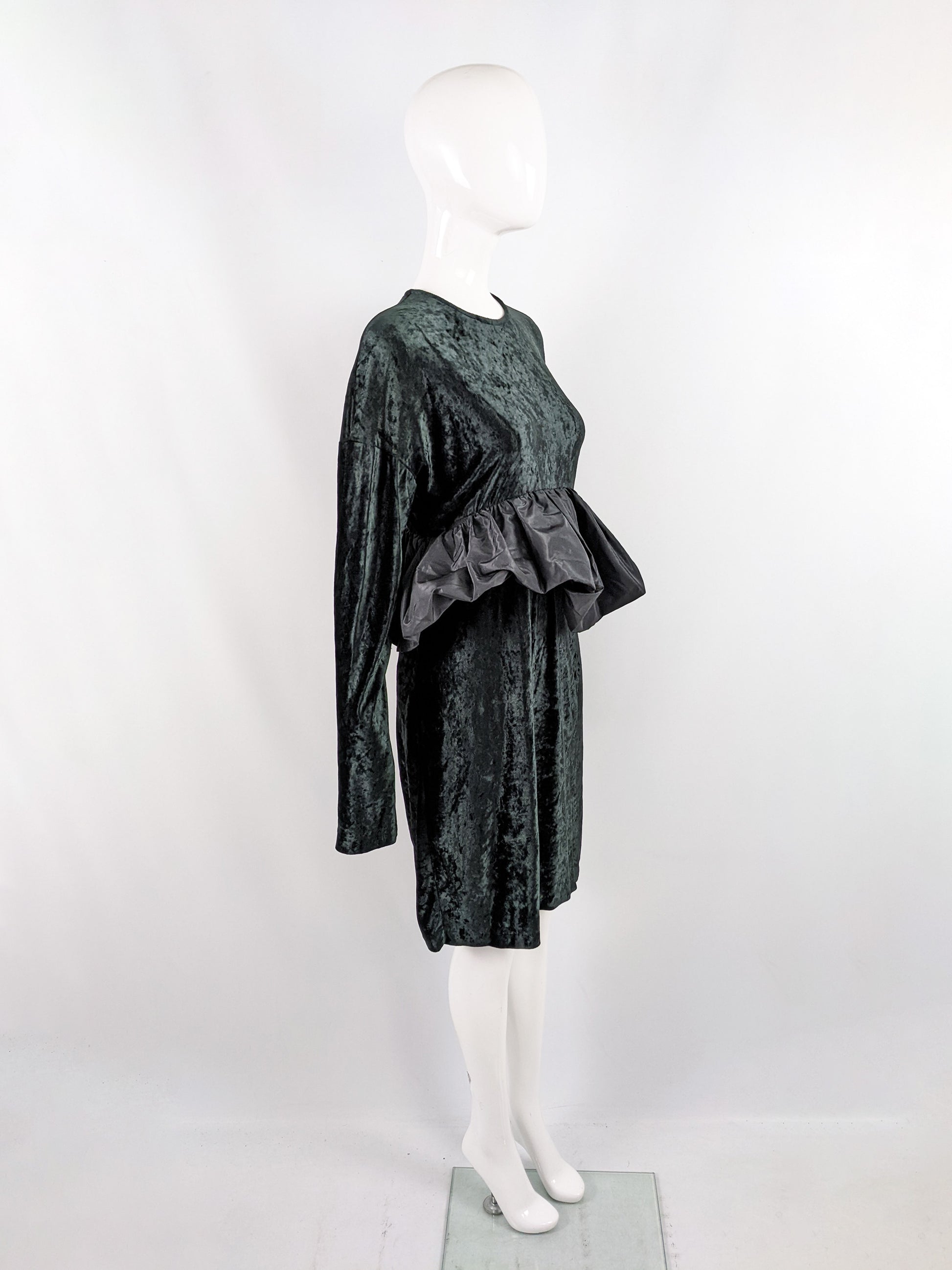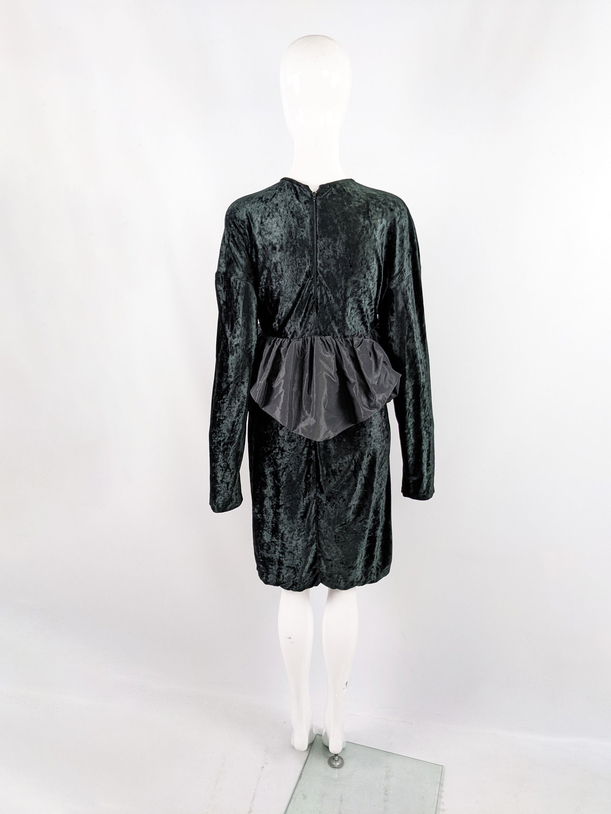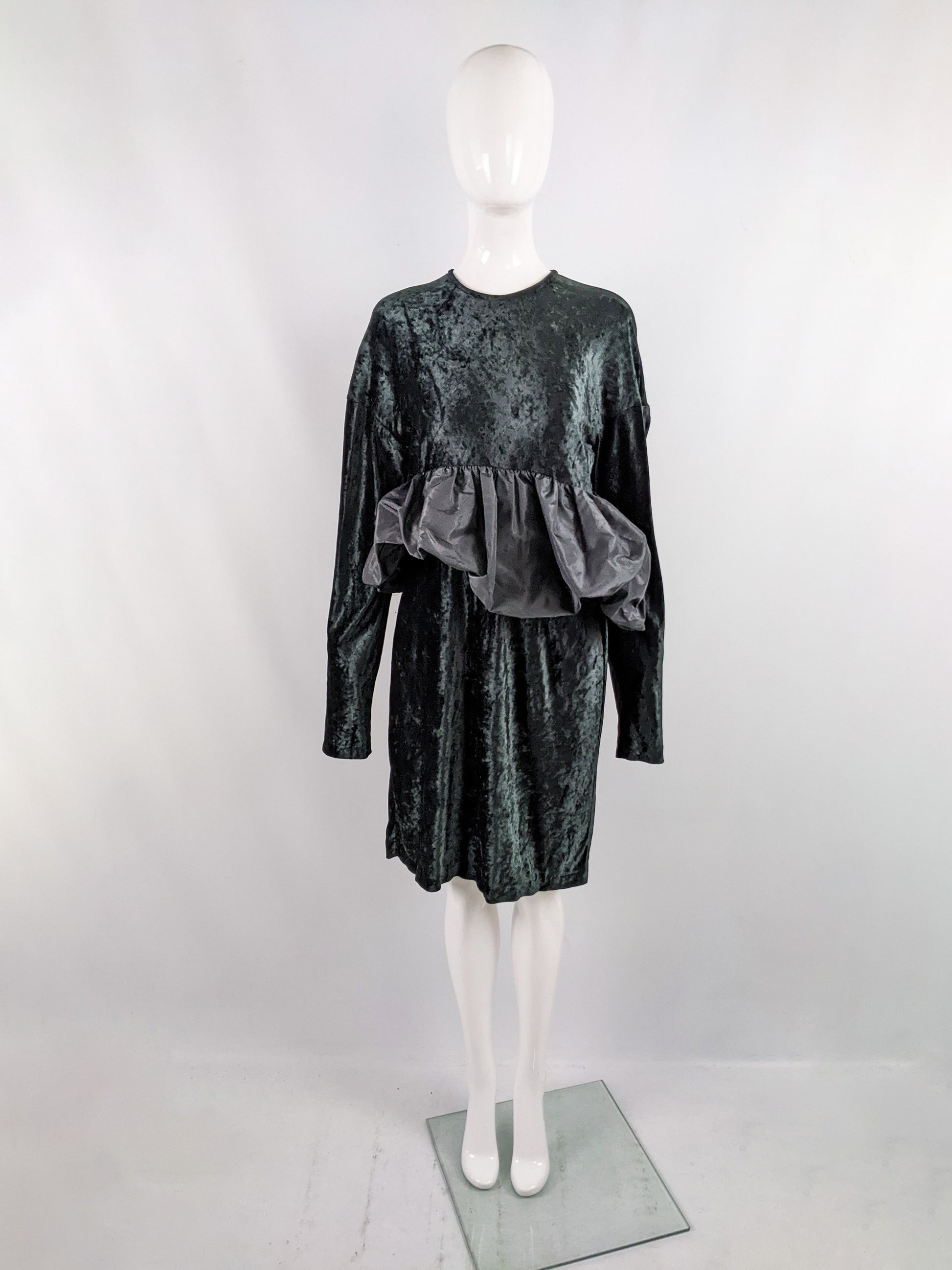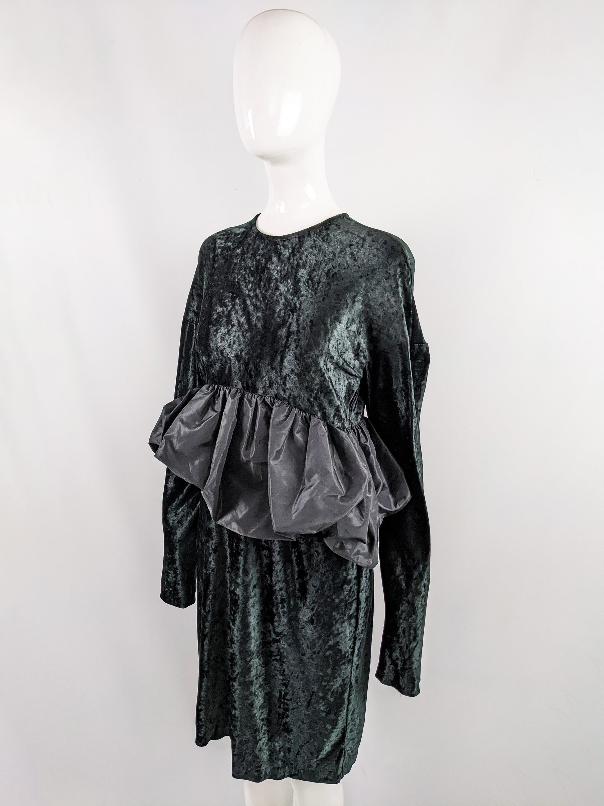 A stunning vintage womens evening dress from the early 90s (probably from the fall 1994 collection) by luxury Italian label Callaghan, designed by legendary designer, Romeo Gigli. In a darkest, darkest green (almost black) panne velvet / velour with a black taffeta asymmetrical puffball detail, which gives a sculptural peplum like effect, showing Gigli's idiosyncratic flair.
