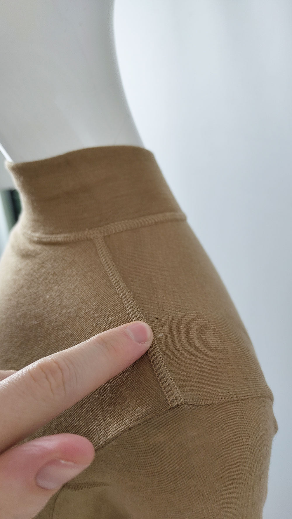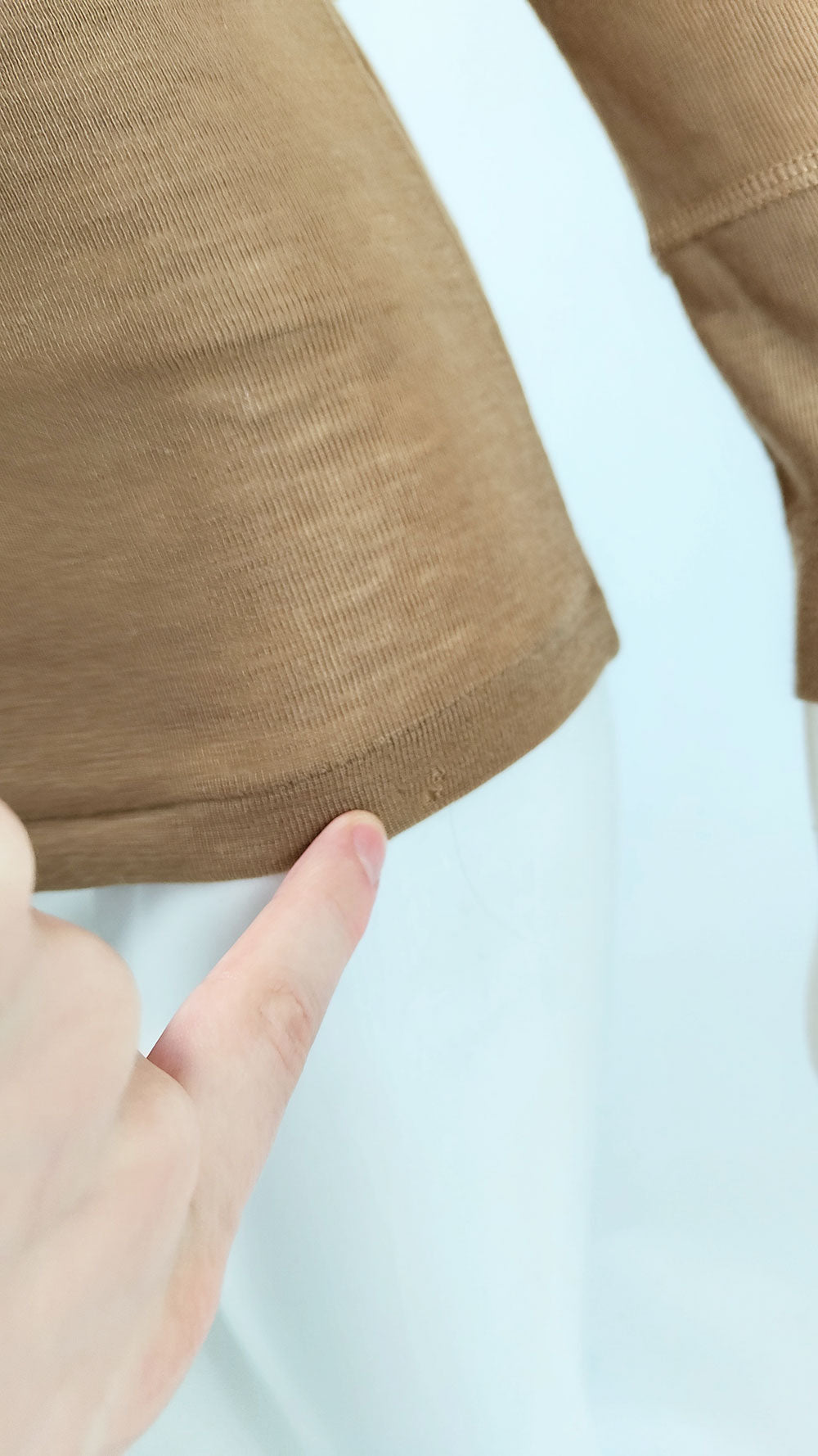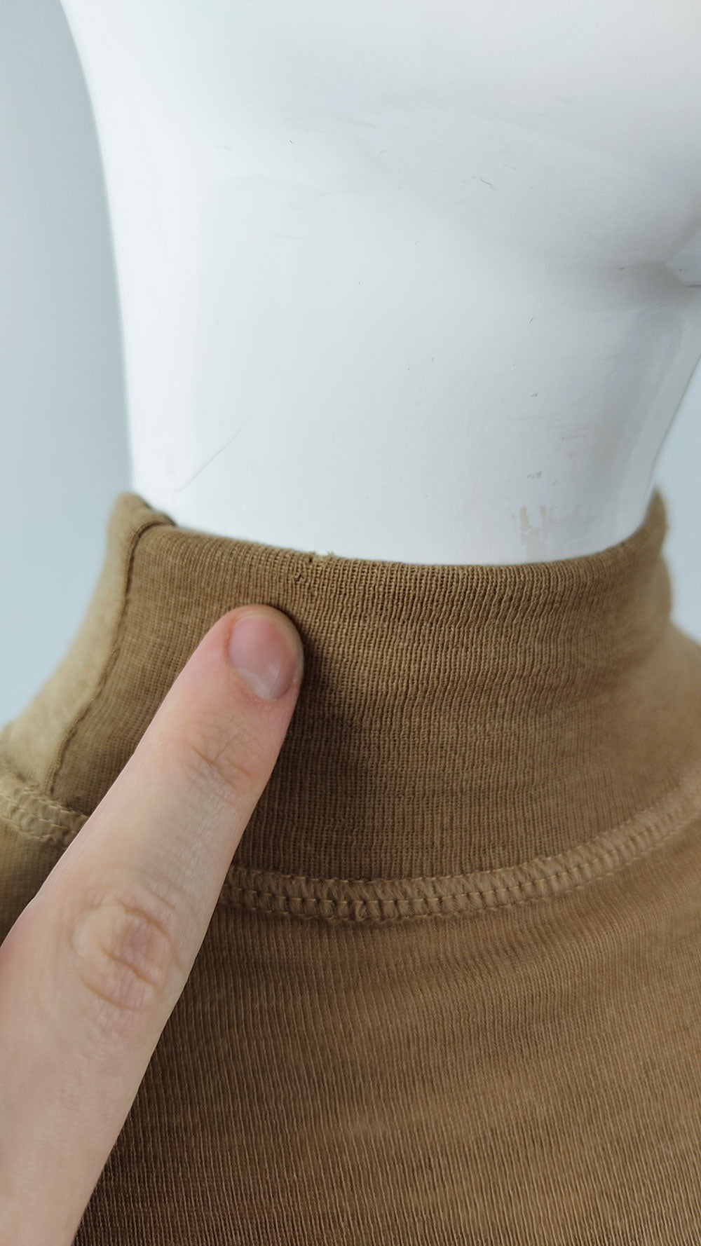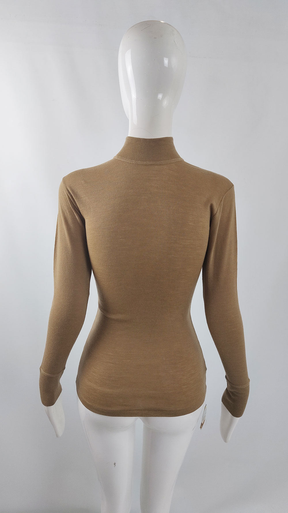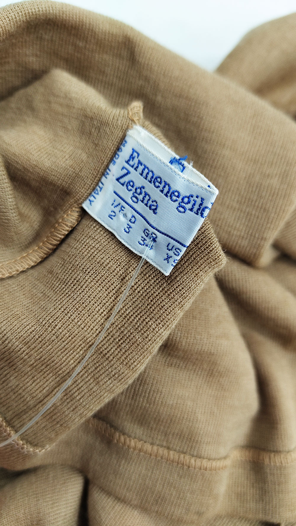 This 90s vintage women's undershirt/long sleeve top from renowned Italian fashion house Ermenegildo Zegna displays a sleek, minimalist look. Crafted in Italy from sumptuous tan pure wool, this piece features flatlock seams, a mock neck, and a figure-flattering slim fit.