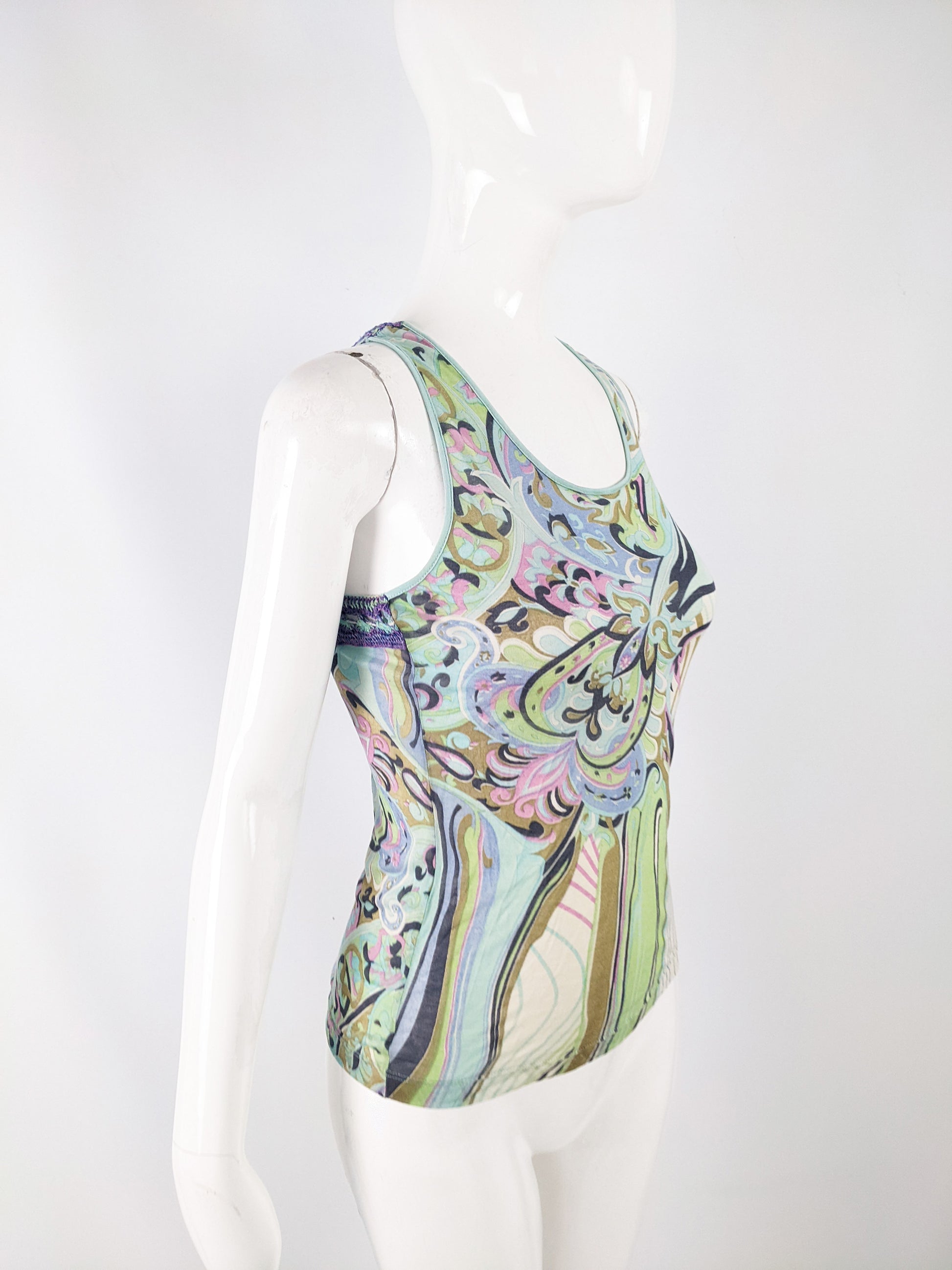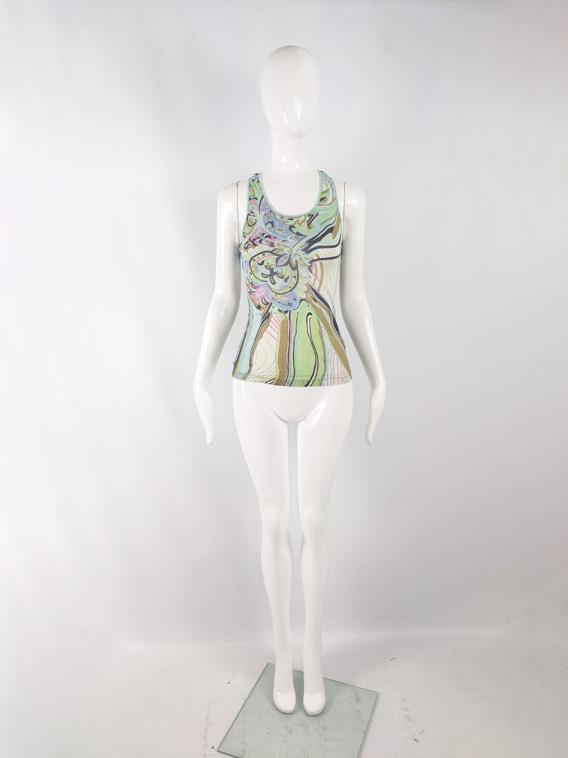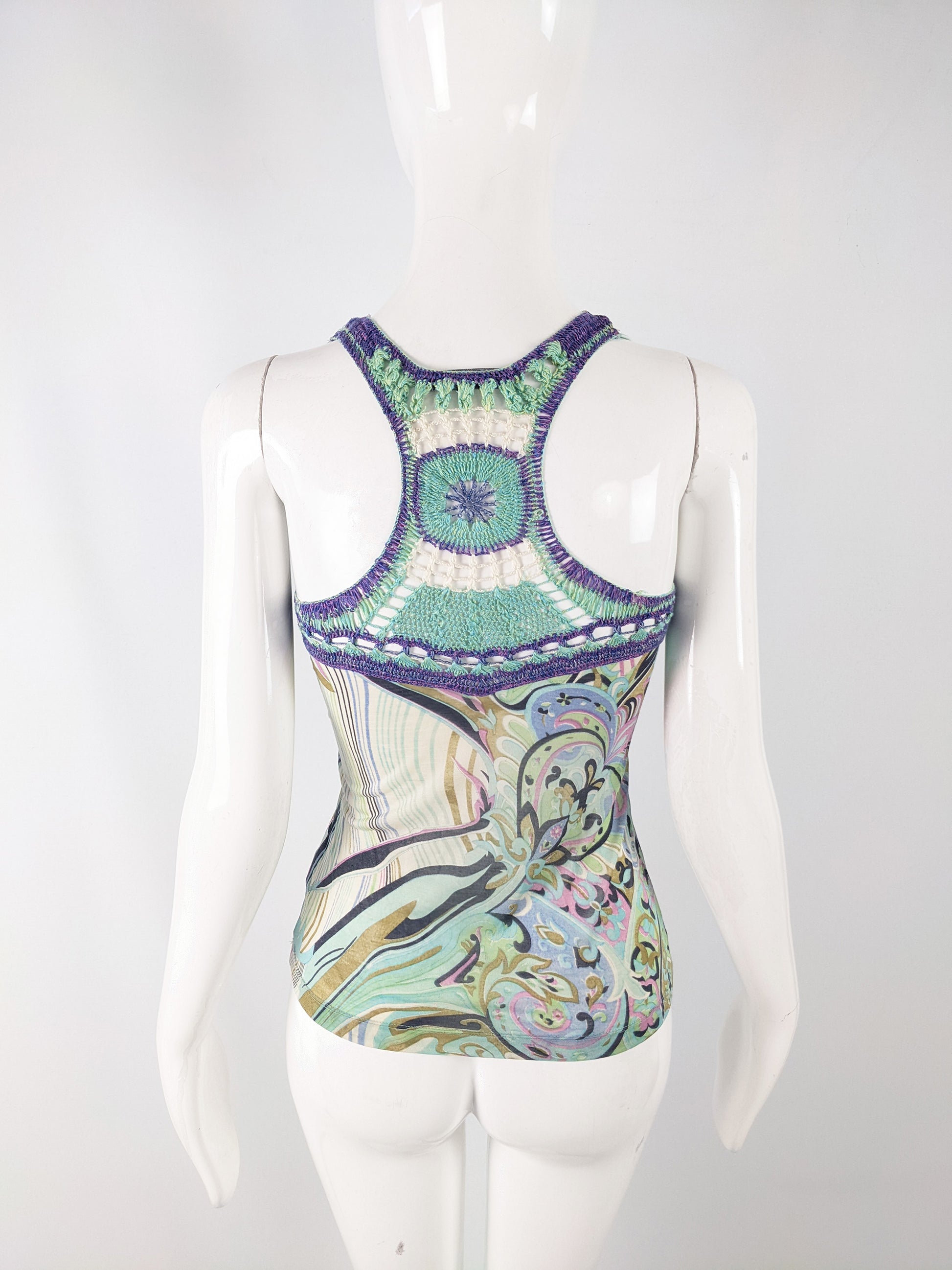 A stunning vintage y2k womens blouse from the late 90s / early 2000s by luxury Parisian label, Etincelle Couture. In a pure silk jersey with a beautiful kaleidoscopic print throughout and a sexy crochet racer back.
