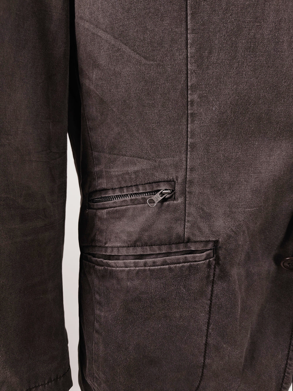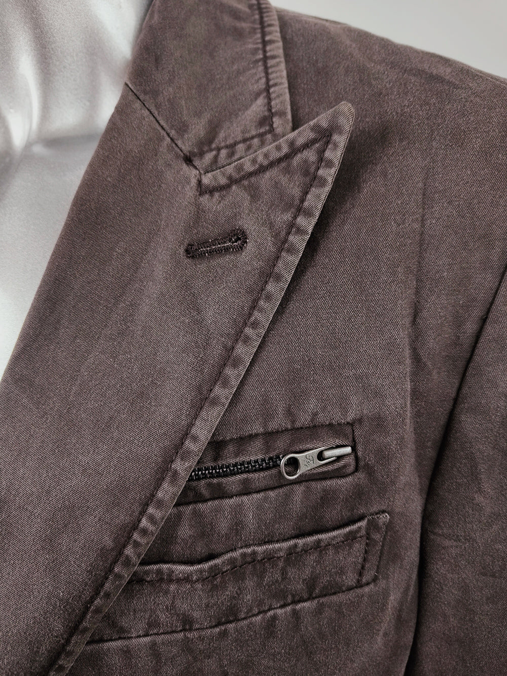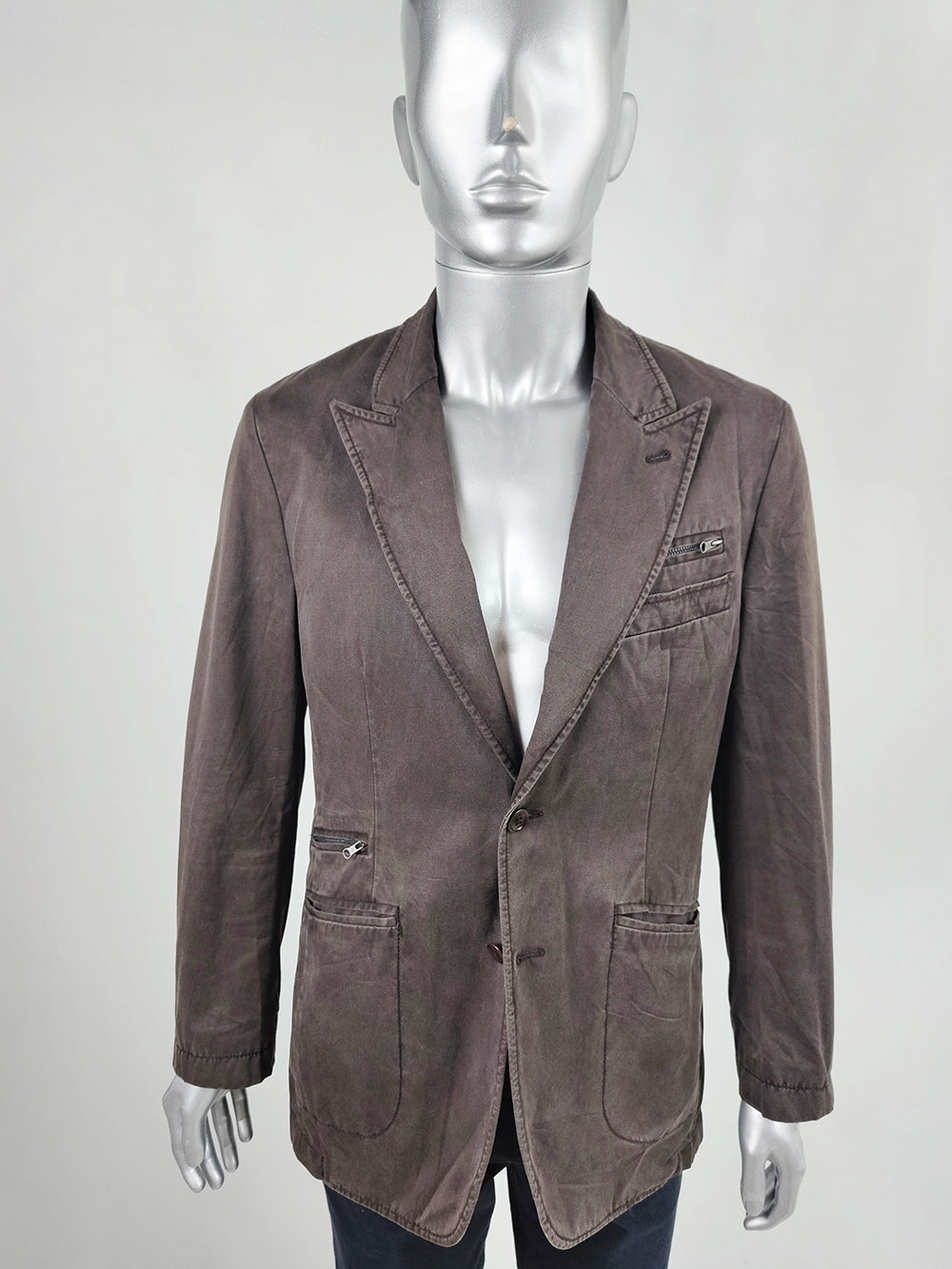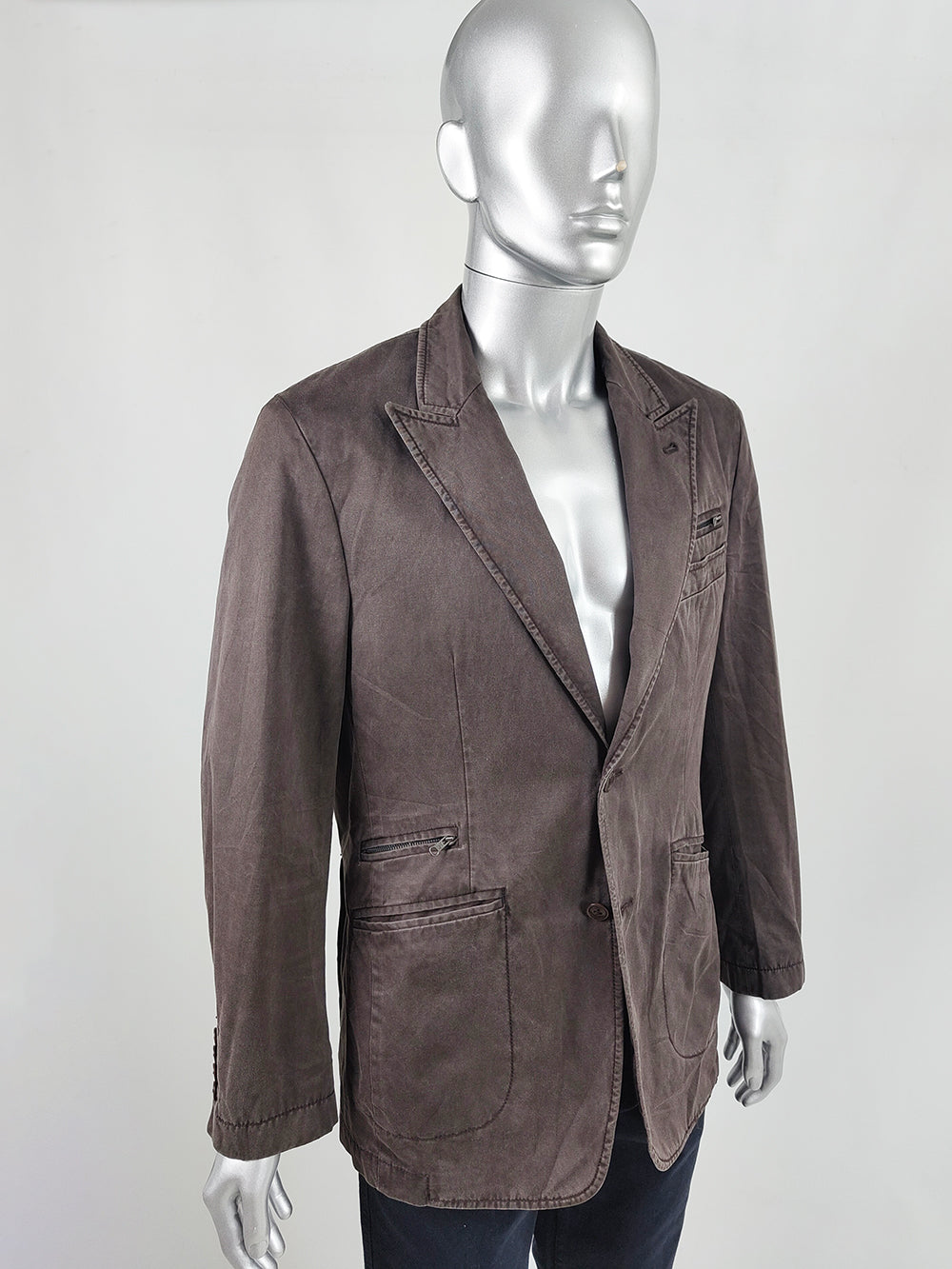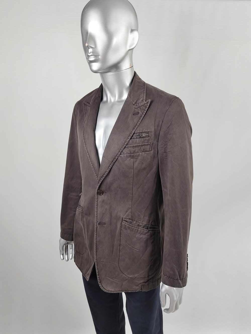 A vintage men’s sport coat from the 1990s to 2000s by Italian luxury label Fay. Made in Italy from washed brown cotton, the blazer has an unstructured fit that creates a relaxed old-money feel. Designed with peak lapels, a single-breasted front, and double rear vents, it is finished with zip details engraved with the Fay logo.