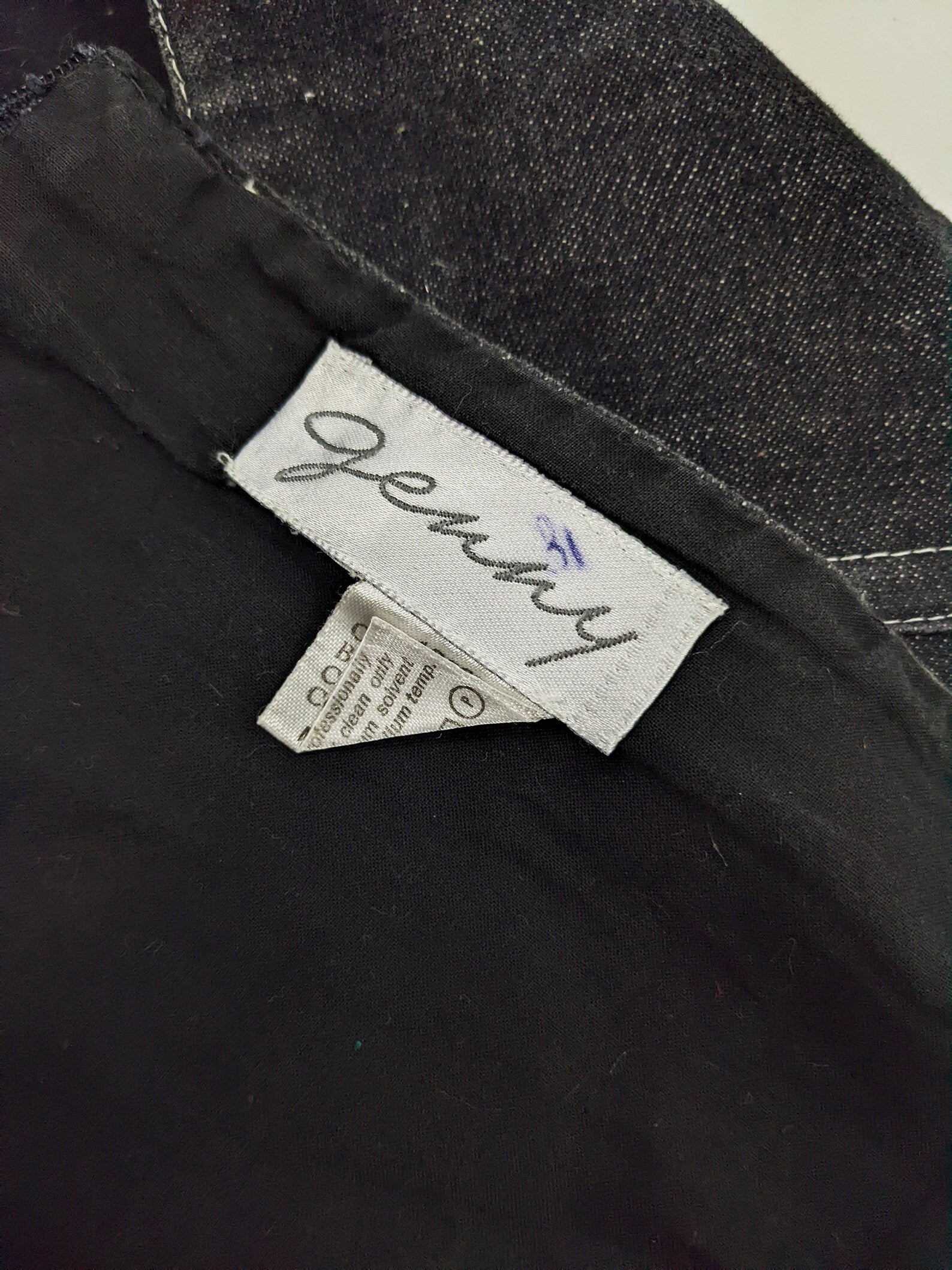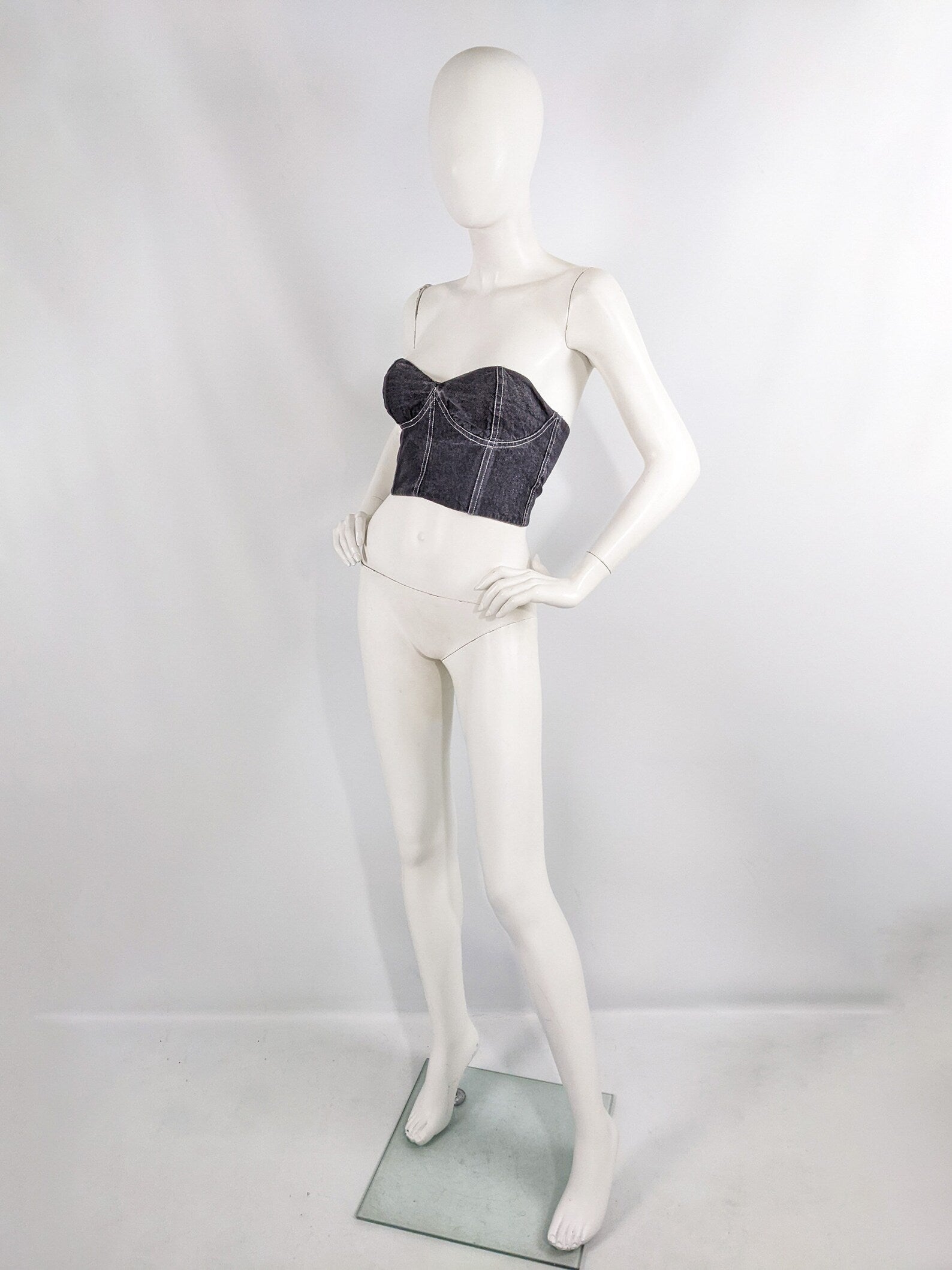 A vintage women’s bustier crop top from the 1980s by Italian fashion house Genny, the label where Gianni Versace once designed before launching his own brand. Made in Italy from black denim with white topstitching, the design has a sweetheart neckline and a structured fit that captures the bold, statement style of the decade.