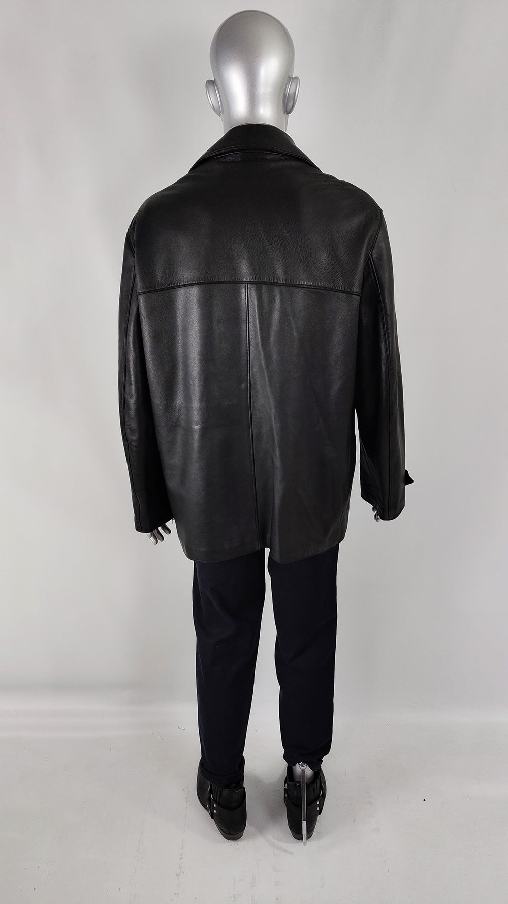 Gianni Versace Vintage Mens Black Leather Overcoat Jacket