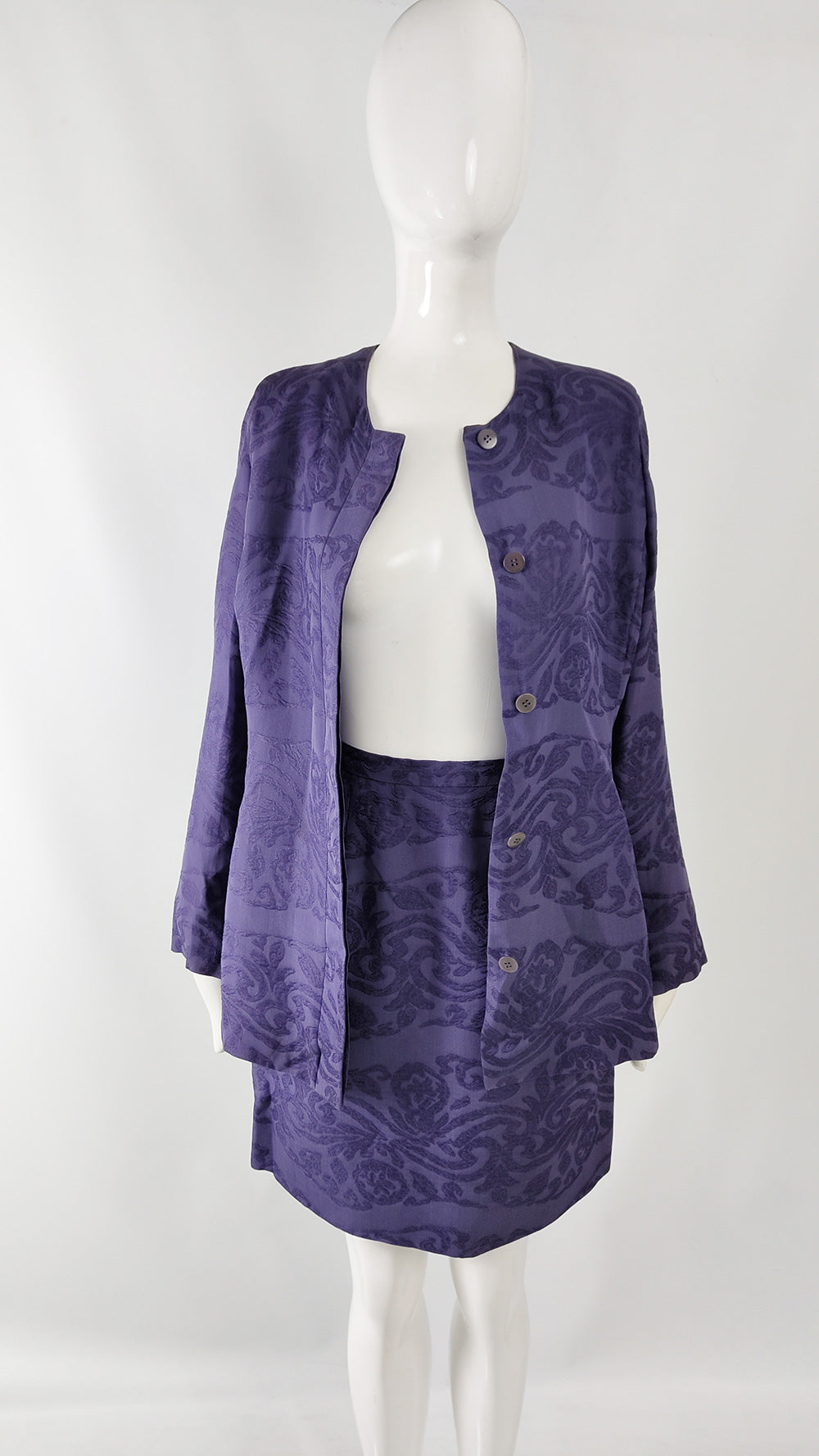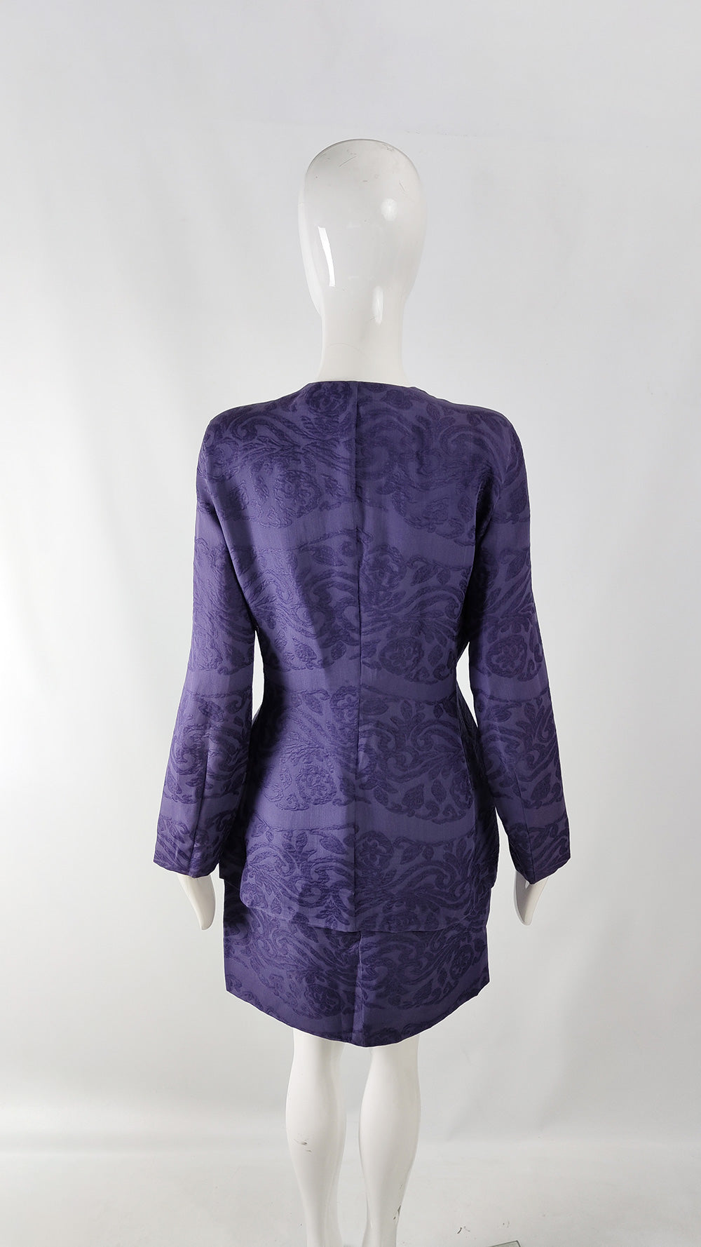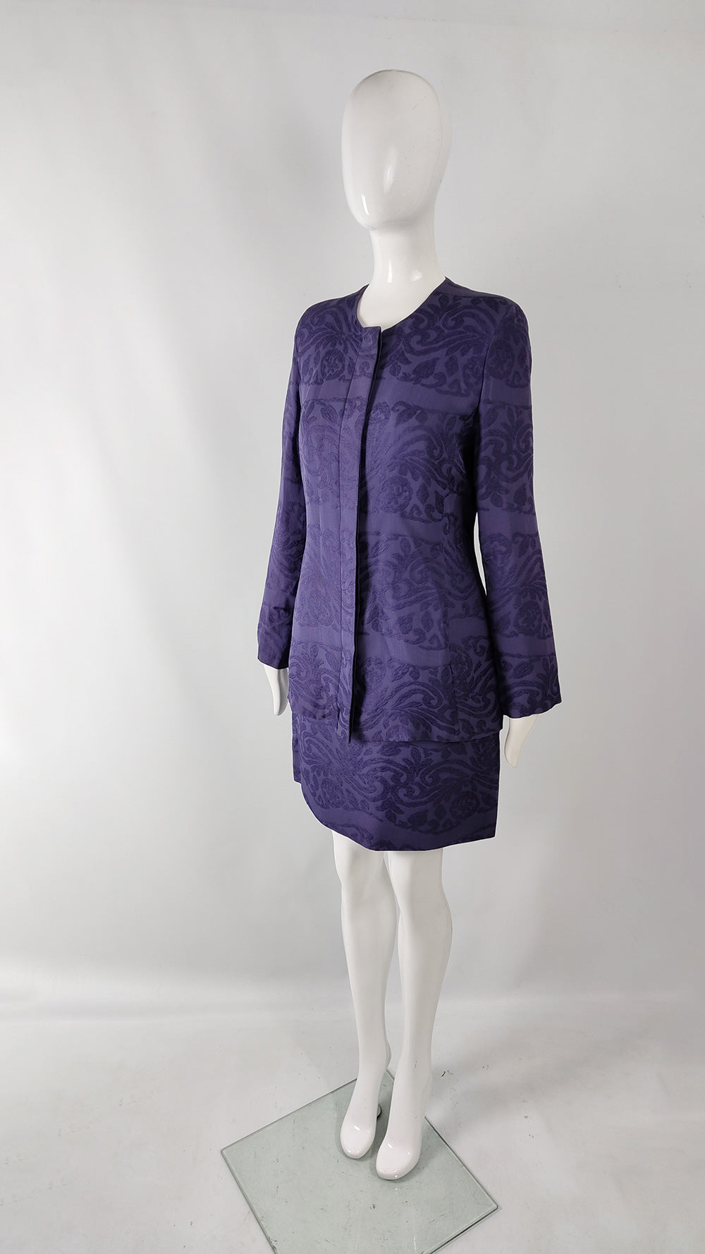 This vintage women’s suit from the 1990s is by Italian designer Giorgio Armani. Made in Italy, it is crafted from purple silk organza woven with a jacquard tapestry design. The ensemble includes a collarless jacket with a concealed button fastening, designed in a clean, minimalist style that reflects Armani’s aesthetic of the decade. The skirt sits at the waist with a fitted band, while the jacket has a softer, blouson shape that narrows at the waist to create an elegant, structured silhouette.