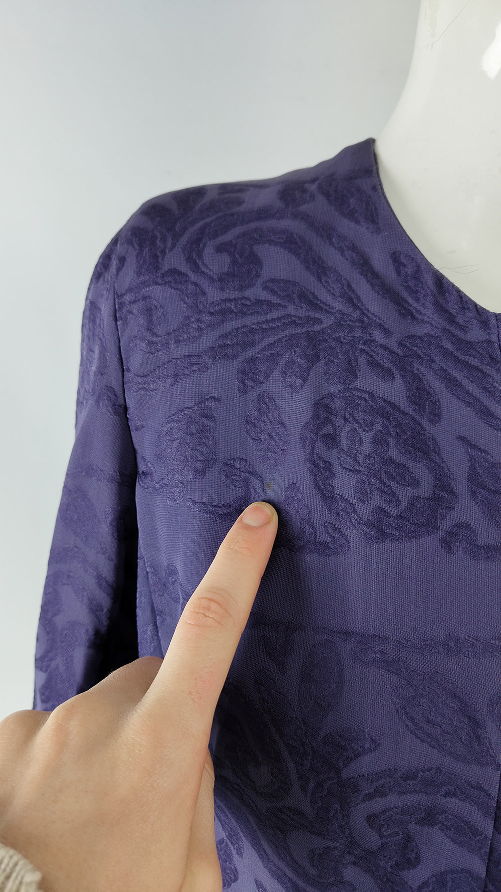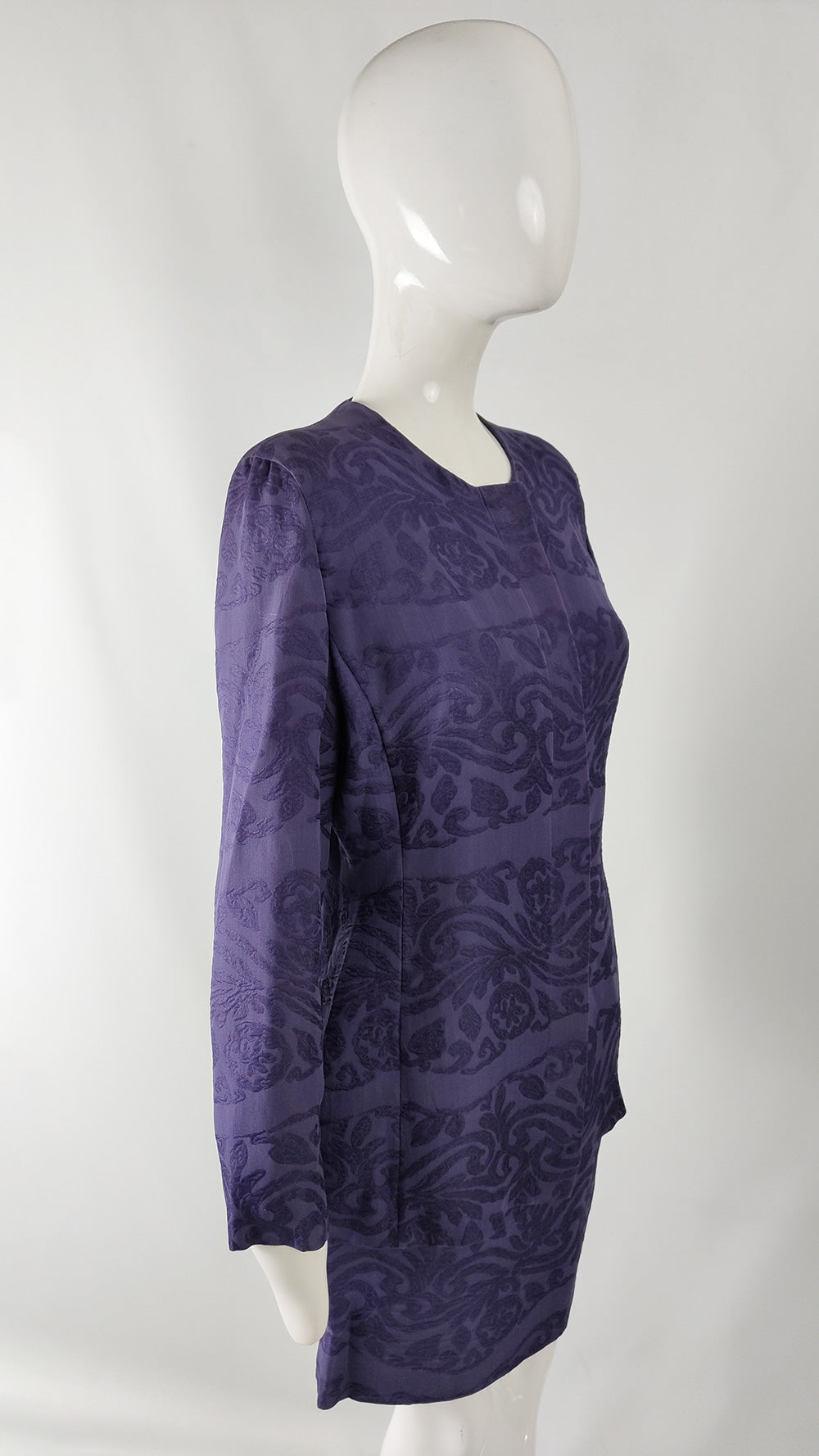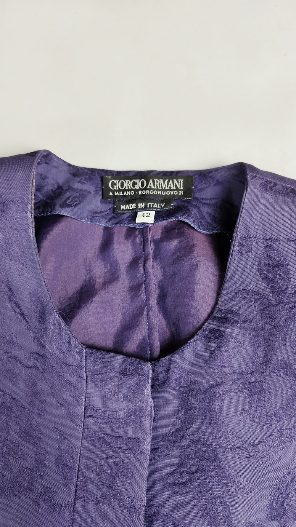 This vintage women’s suit from the 1990s is by Italian designer Giorgio Armani. Made in Italy, it is crafted from purple silk organza woven with a jacquard tapestry design. The ensemble includes a collarless jacket with a concealed button fastening, designed in a clean, minimalist style that reflects Armani’s aesthetic of the decade. The skirt sits at the waist with a fitted band, while the jacket has a softer, blouson shape that narrows at the waist to create an elegant, structured silhouette.