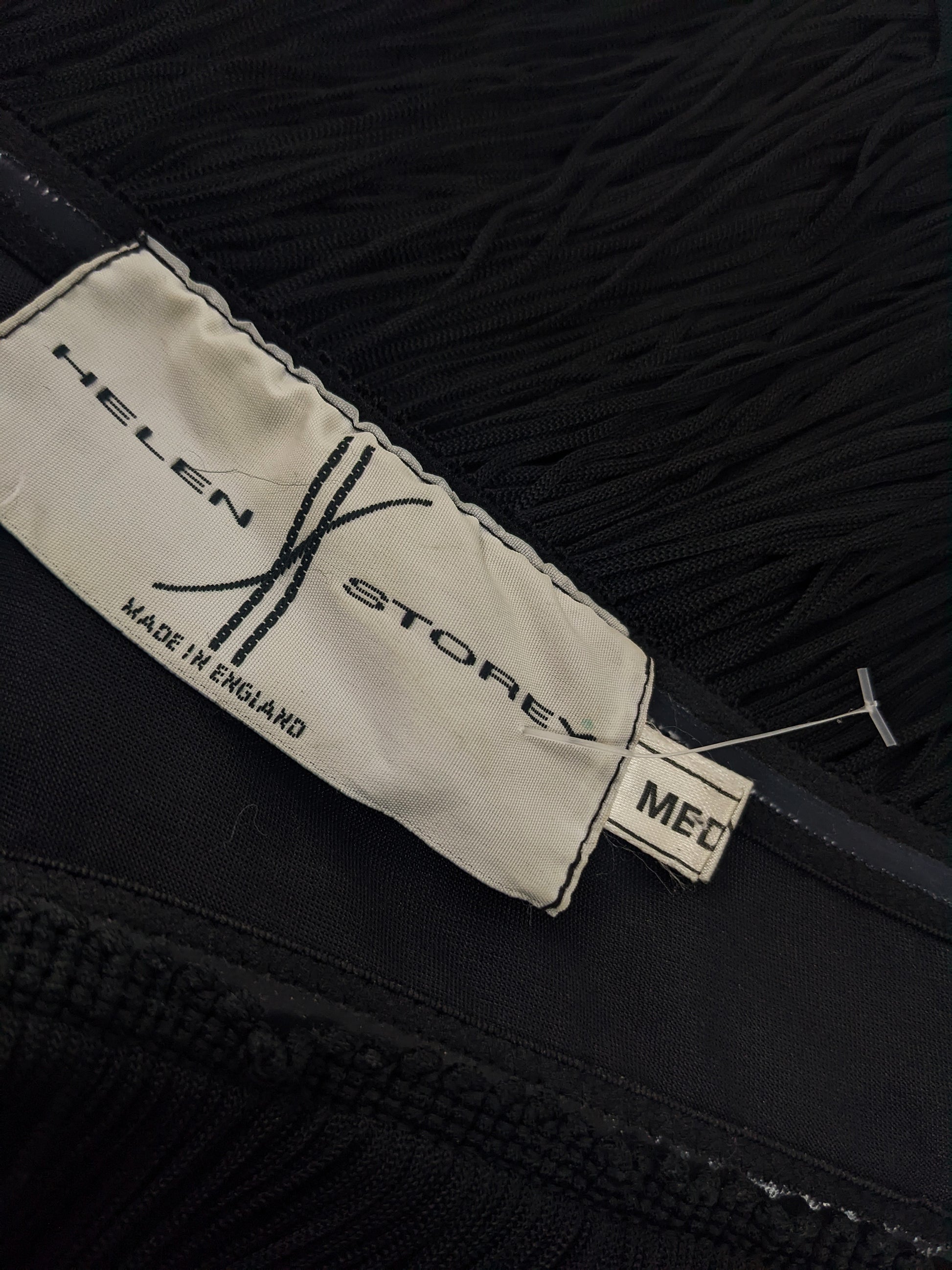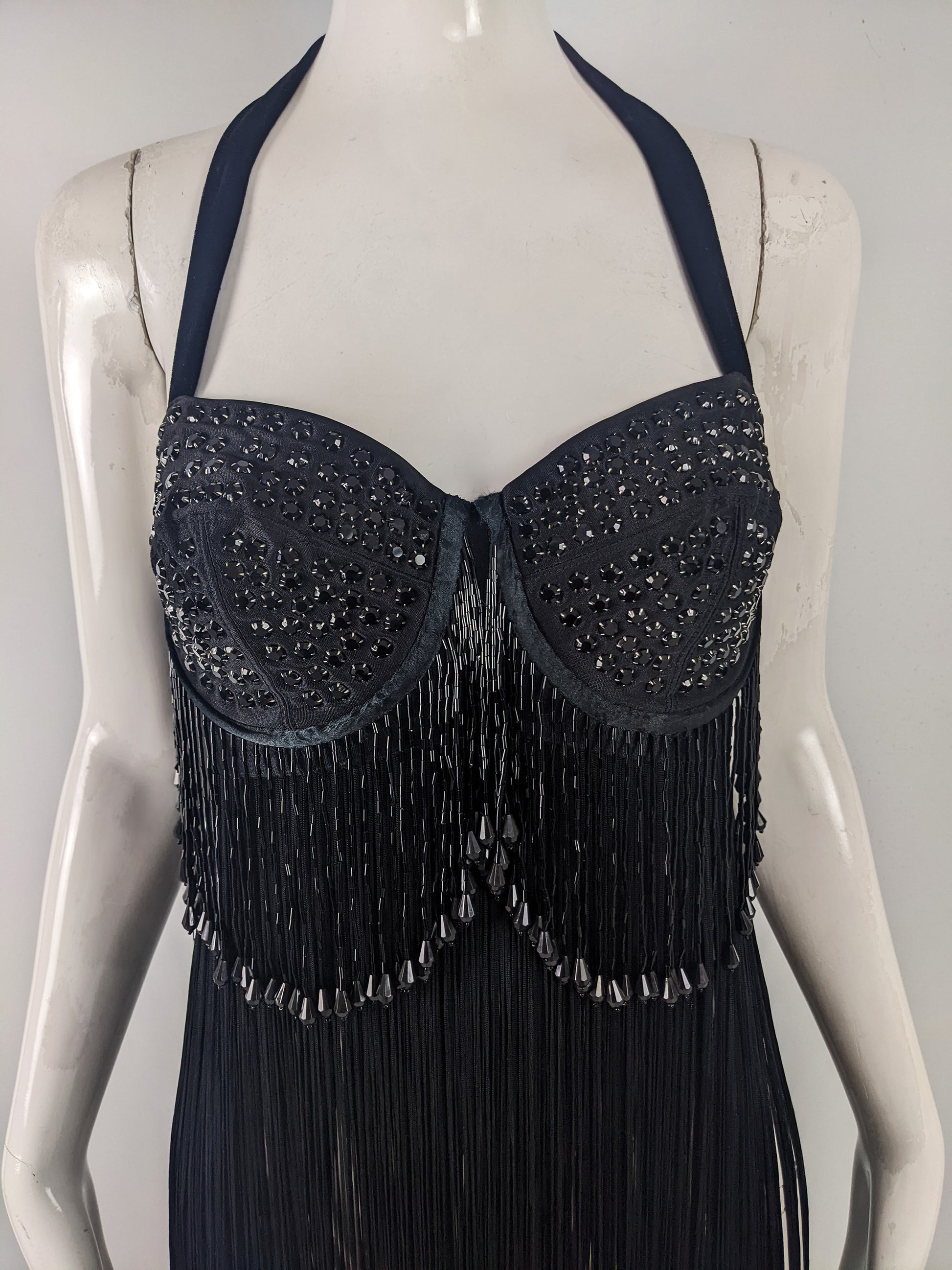 A striking and avant garde vintage womens bralette/ bustier top from the 90s by singular British icon, Helen Storey, a rare and collectible artist and fashion designer who was known for her experimental, innovative designs worn by the likes of Madonna and Cher and is now a Professor of fashion science. In a black nylon jersey with boned cups embellished with black rhinestone beading. From the cups glass bugle beaded tassels hang, with further fringing dangling down to the knees creating an incredibly dramatic look. It has a black velvet halter neck (that may have been added later, but could be easily removed with a seam ripper) to give further support.