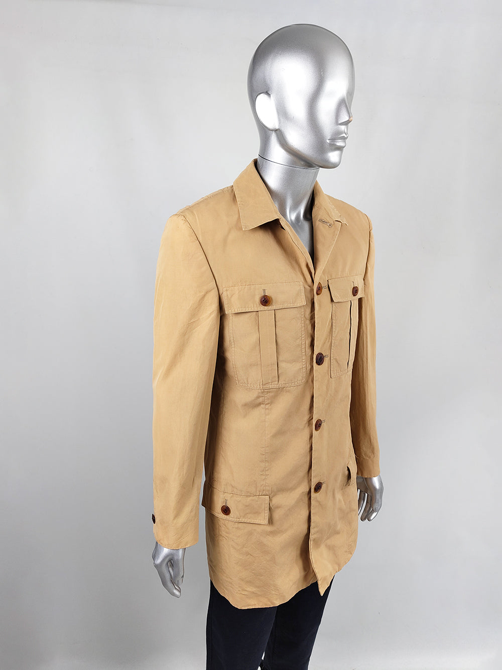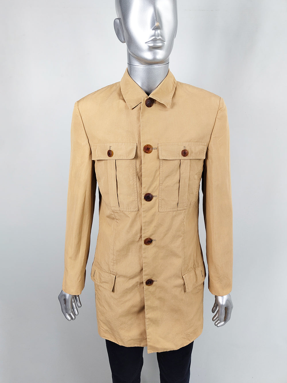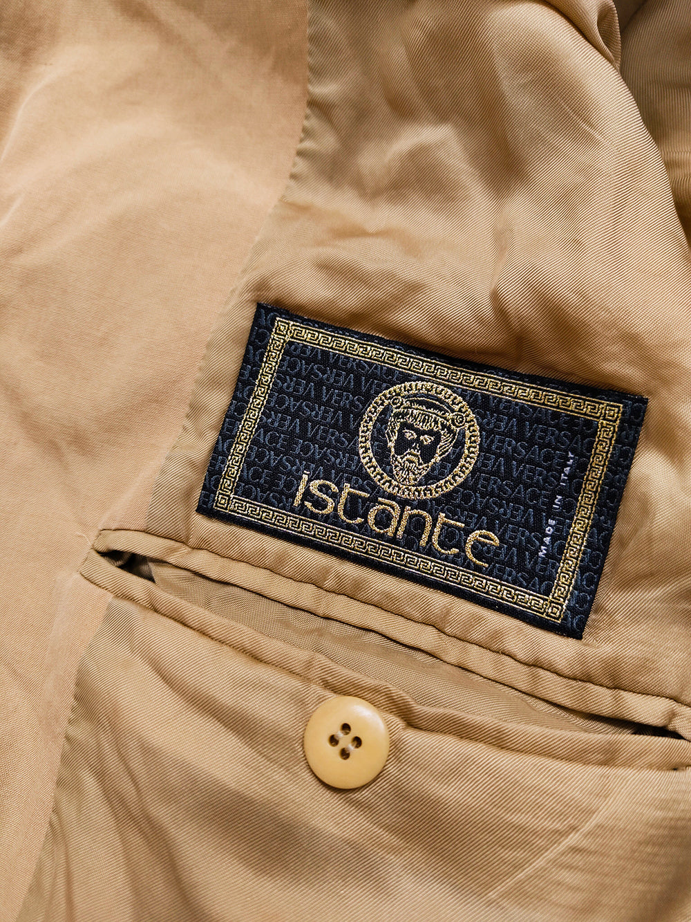 A vintage men’s jacket from the 1990s by Italian fashion house Versace, created for the Istante line, which sat above Versus and Versace Jeans in exclusivity. Made in Italy from tan pure cotton, the lightweight design includes pleated patch pockets at the chest, flap pockets on the lower half, and engraved Istante-logo buttons that add a statement finish. Cut to a hip length, it works well as a transitional spring coat.