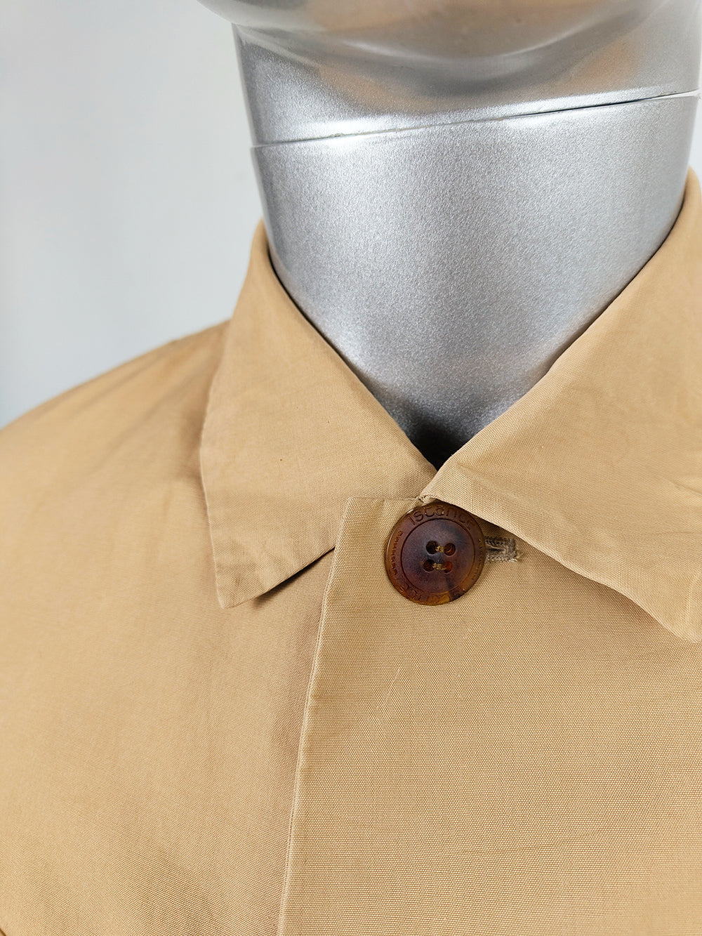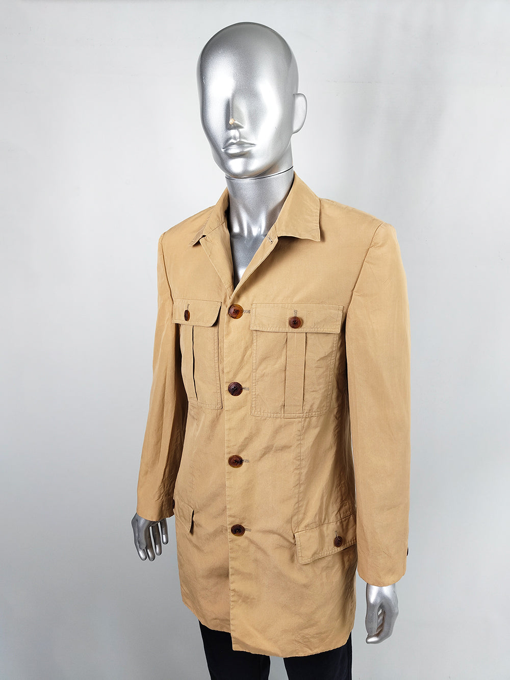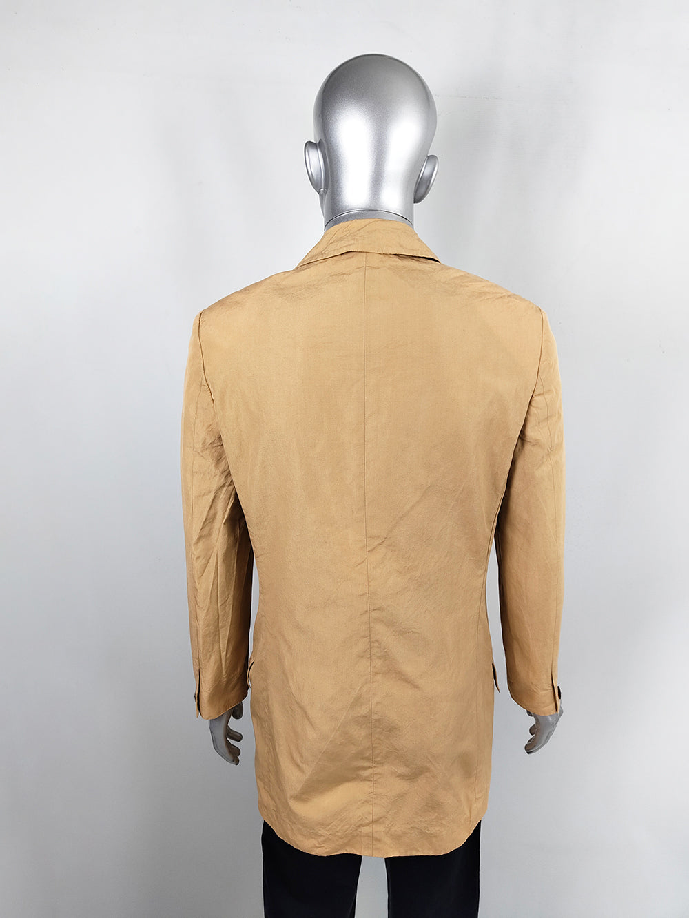 A vintage men’s jacket from the 1990s by Italian fashion house Versace, created for the Istante line, which sat above Versus and Versace Jeans in exclusivity. Made in Italy from tan pure cotton, the lightweight design includes pleated patch pockets at the chest, flap pockets on the lower half, and engraved Istante-logo buttons that add a statement finish. Cut to a hip length, it works well as a transitional spring coat.