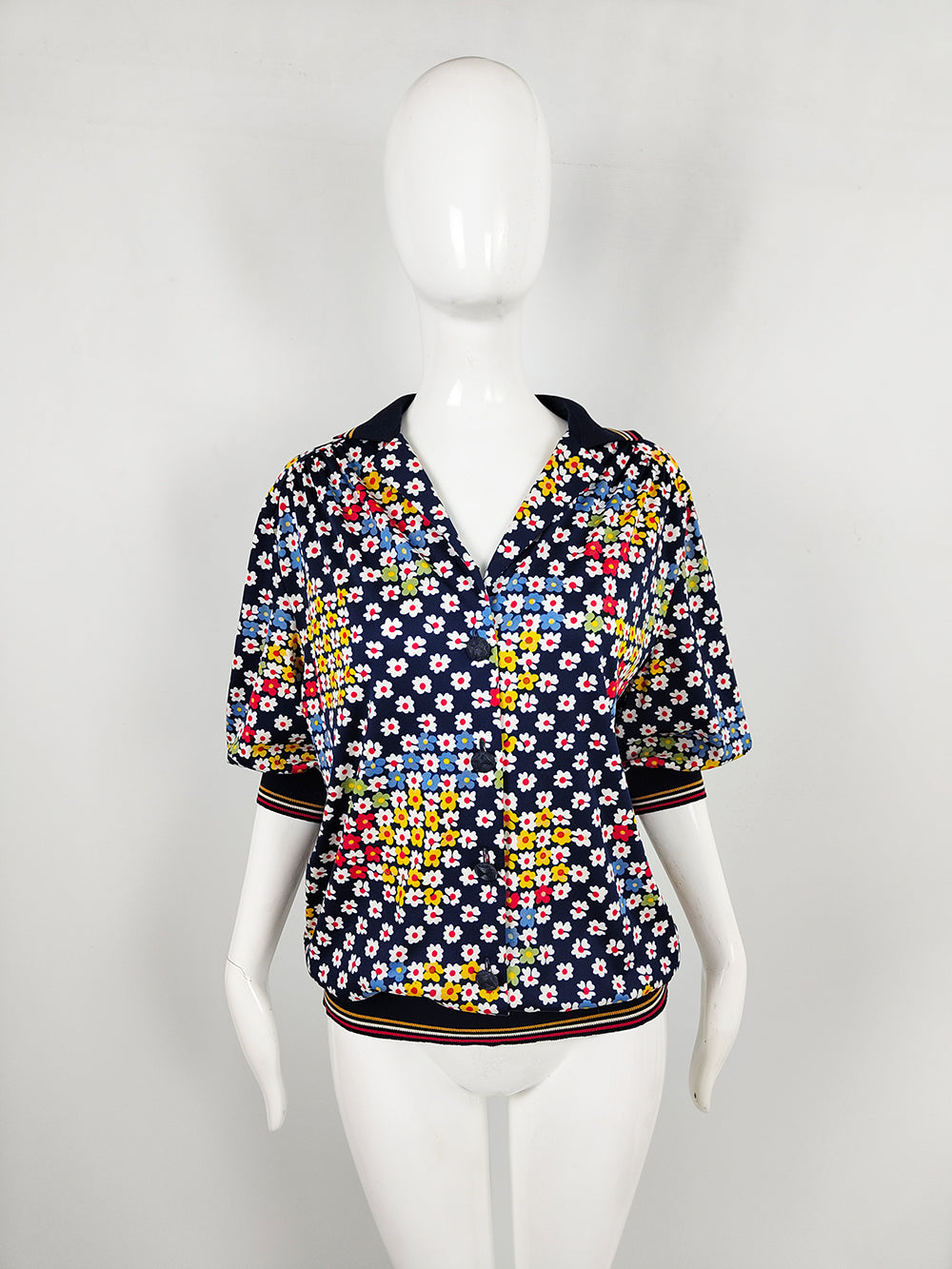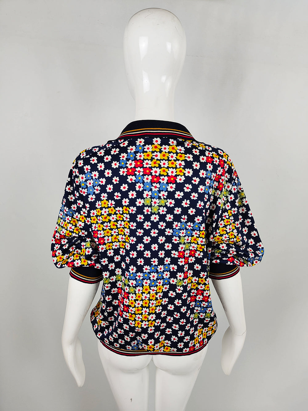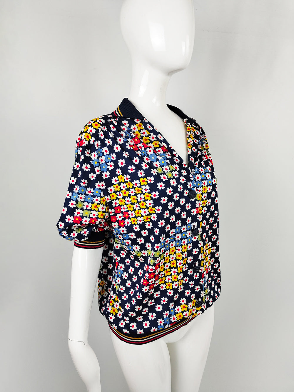 A vintage women’s short-sleeve top from the 1980s by Italian label Liola. Made in Italy, it is cut from a navy fabric printed with colourful daisies. Designed with a loose blouson silhouette, the style is finished with rib-knit cuffs and hem that give the sleeves a puffed effect.