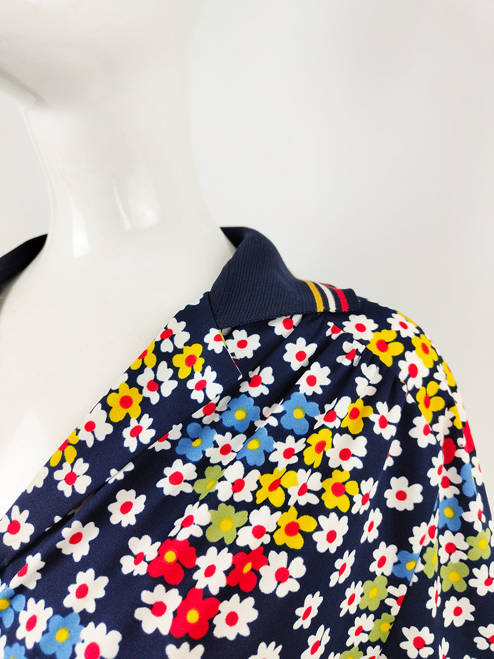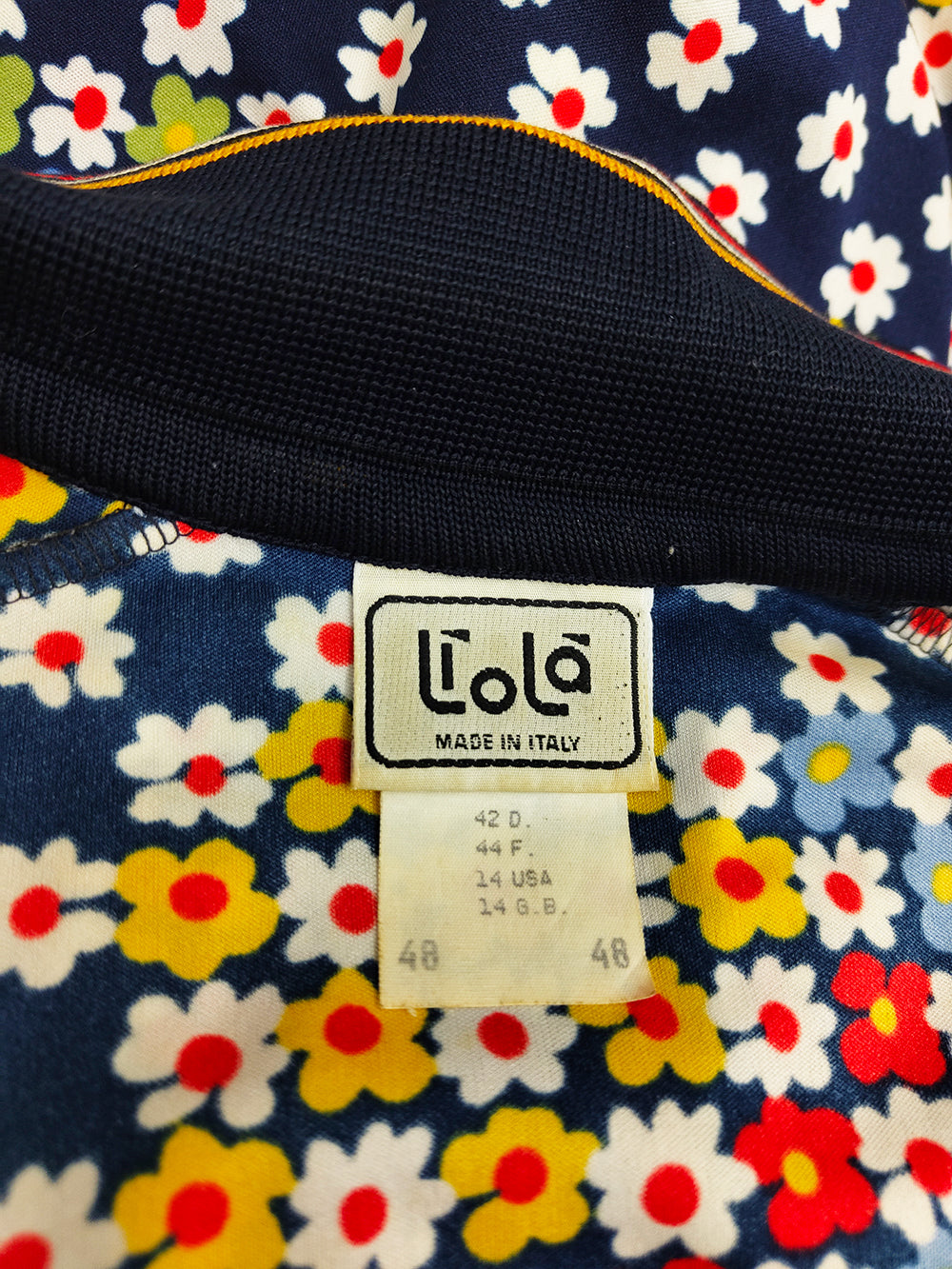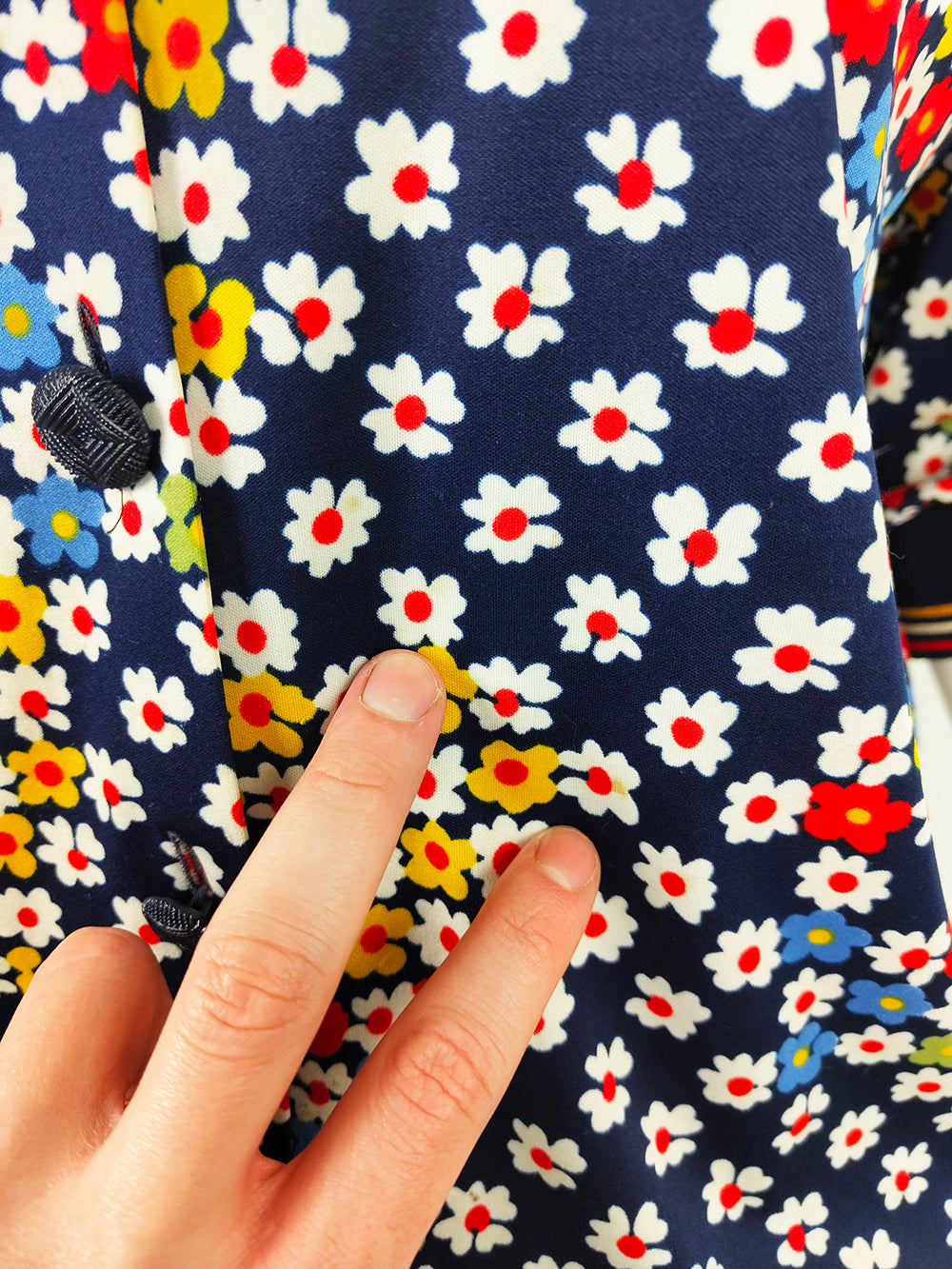 A vintage women’s short-sleeve top from the 1980s by Italian label Liola. Made in Italy, it is cut from a navy fabric printed with colourful daisies. Designed with a loose blouson silhouette, the style is finished with rib-knit cuffs and hem that give the sleeves a puffed effect.