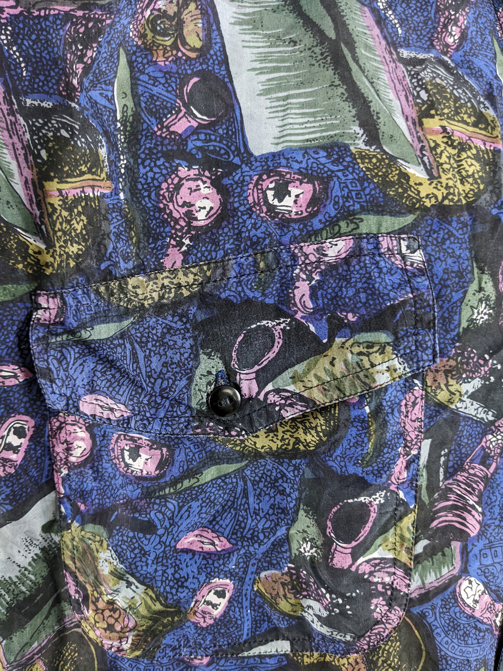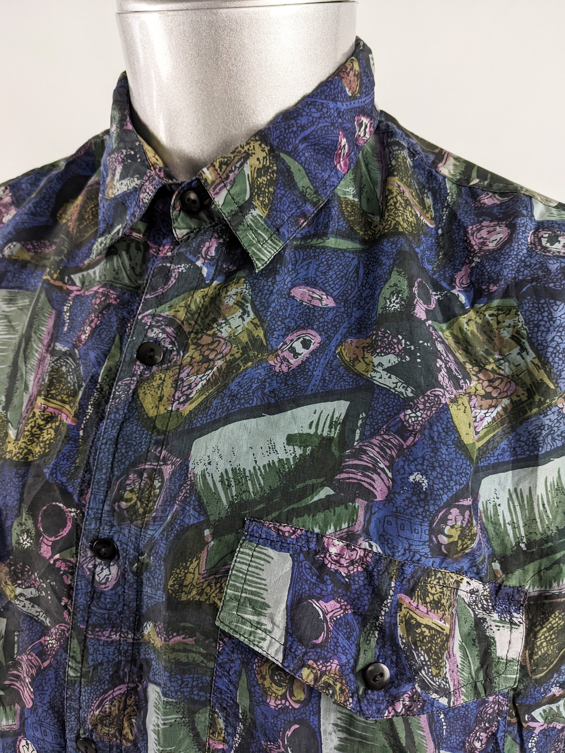 A vintage men’s shirt from the 1990s by French designer Naf Naf. Made from blue pure silk, the fabric is printed with an abstract green and pink pattern that gives the piece a bold, summery feel. Designed with short sleeves and a relaxed, oversized cut, it reflects the playful, graphic aesthetic associated with the label during the decade.