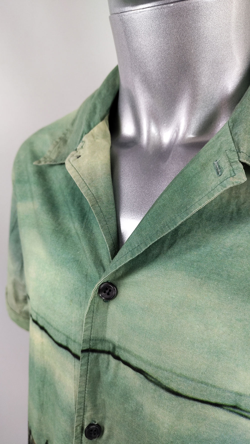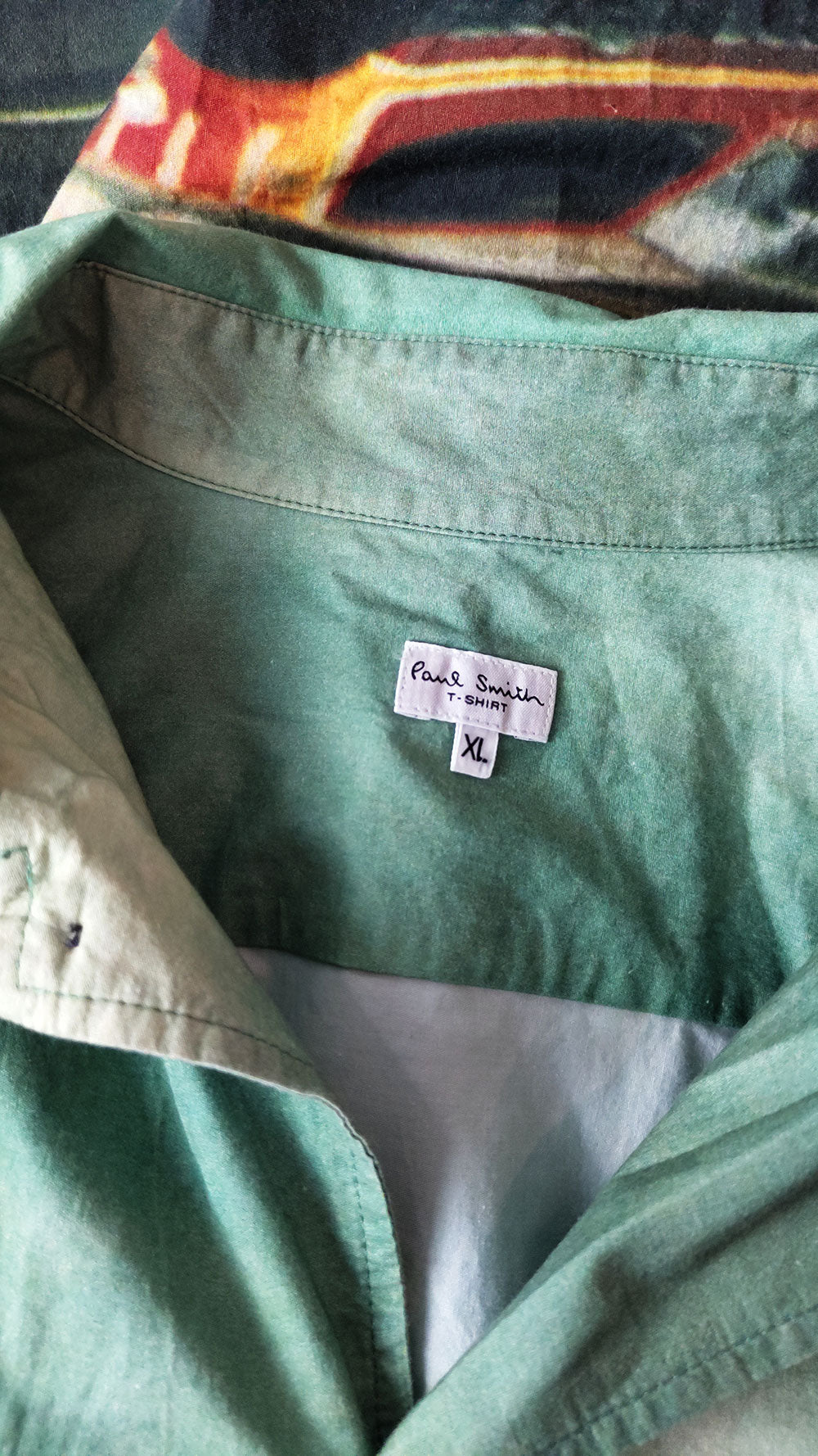 A fantastic and hard-to-find vintage mens shirt from the '90s by luxe British fashion designer Paul Smith. One of his legendary and highly sought-after photo print shirts, this scarce top features a bold all-over print of a drag/stock car race. Short sleeves and a slightly loose fit make for an effortlessly cool look.