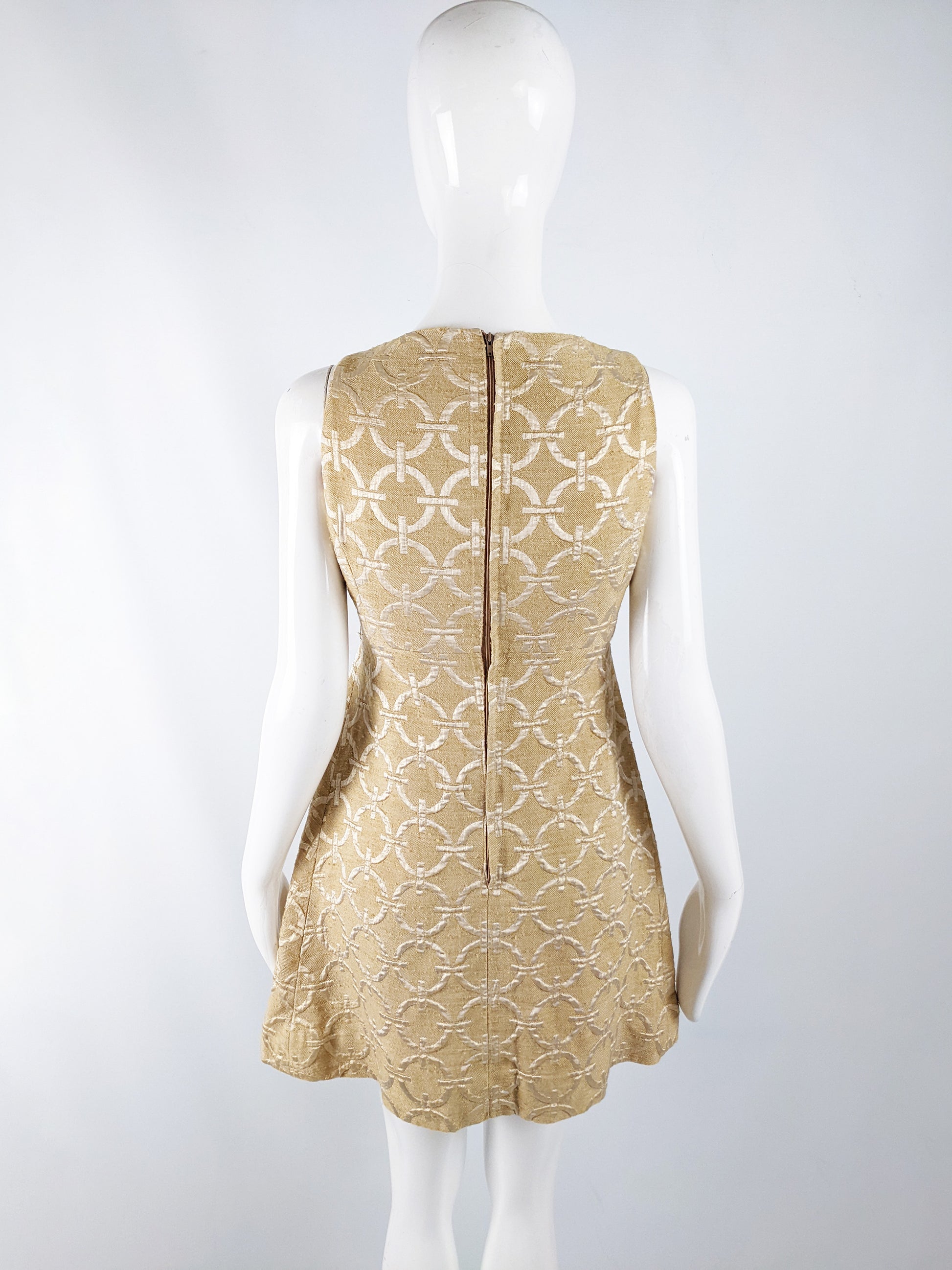 An incredible and rare vintage womens mini dress from the 60s by luxury British boutique designer, Peter Collins of Mayfair. In a thick cotton fabric with a gold quilted brocade creating a futuristic chain design throughout. The sexy cut out design in the middle adds to this space age feel popular in the 60s mod era. It has a v neck with a mini length and sleeveless design for a flirty, fresh feel.
