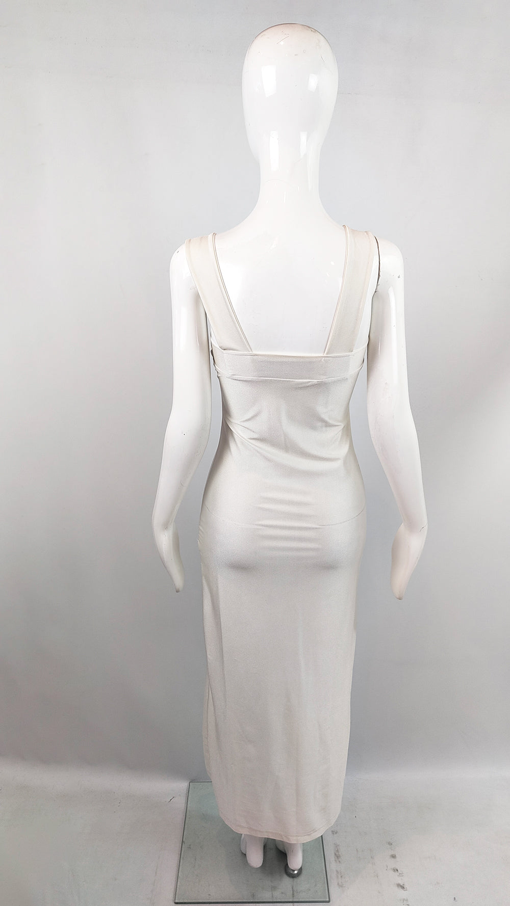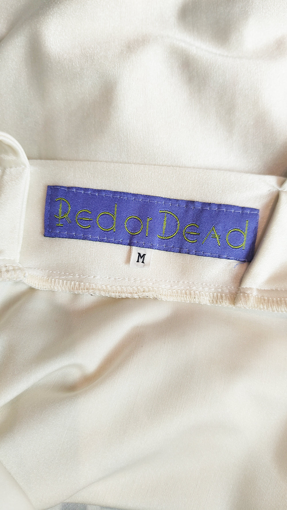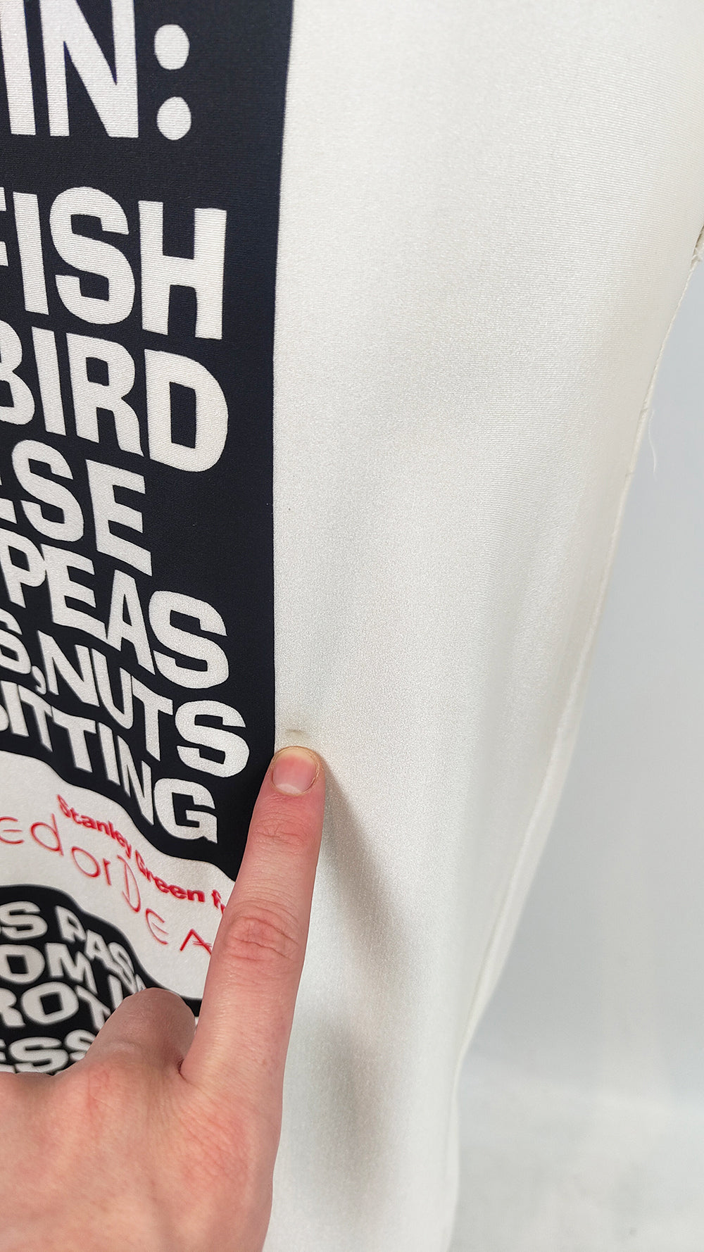 A vintage women’s maxi dress from the Spring/Summer 1993 collection by British designer label Red or Dead. Made in a white jersey fabric, the dress is printed with the iconic “Less Passion from Protein” imagery associated with Stanley Green, the London eccentric known for carrying his handwritten placards through Oxford Street for decades. The graphic text was adopted by Red or Dead for this collection and has since become one of the brand’s most recognisable pop-art designs. Cut in a long, fluid silhouette, the dress reflects the label’s blend of fashion, social commentary, and British street culture.