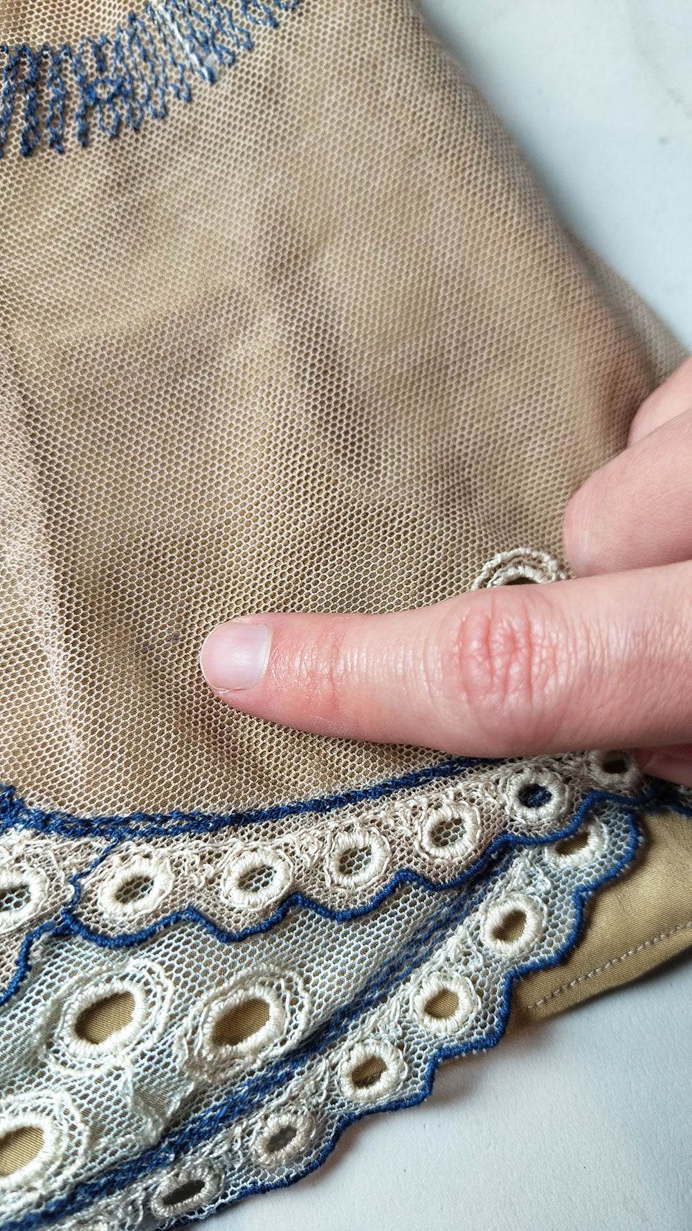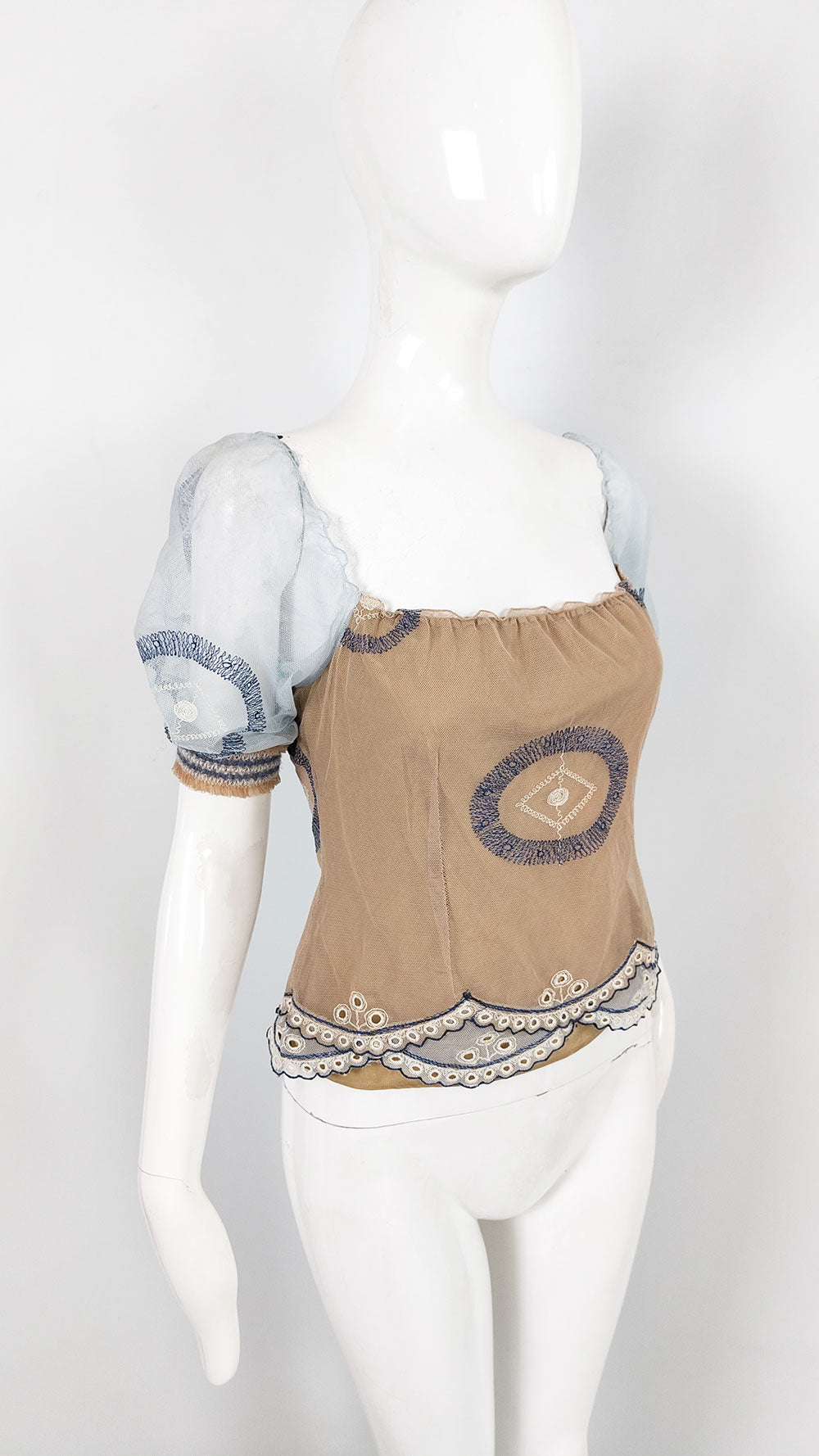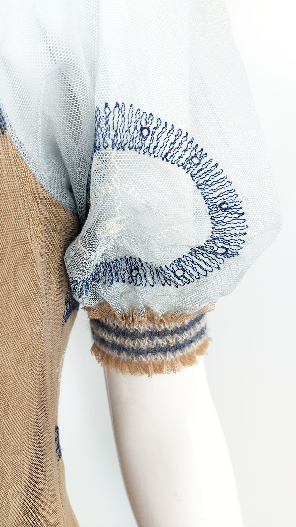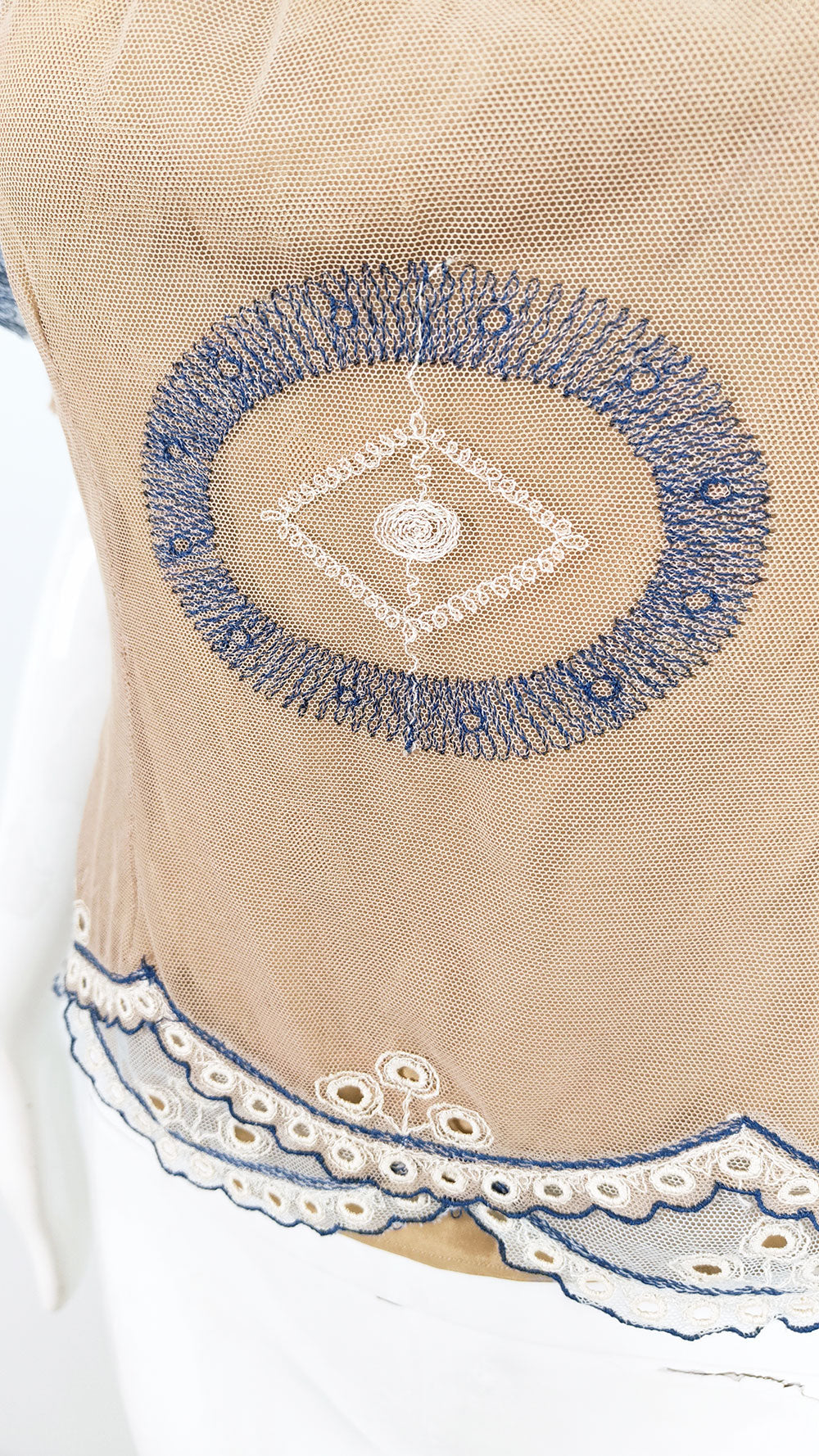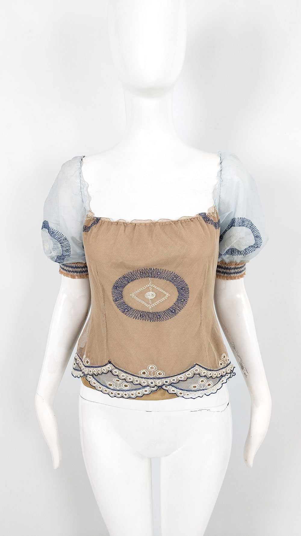 Ronit Zilkha Vintage Nude & Pastel Blue Mesh Embroidered Top