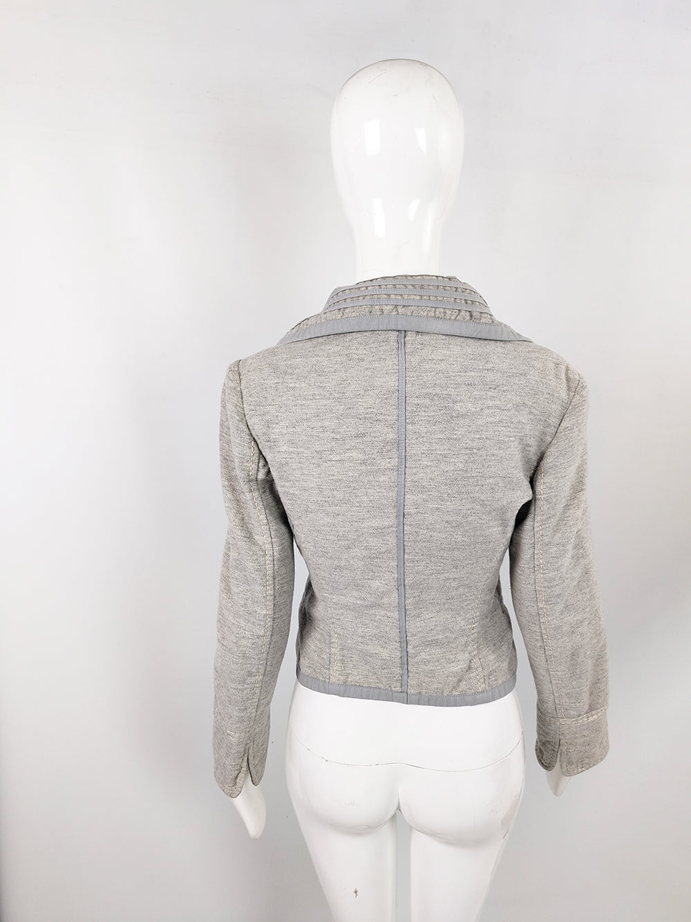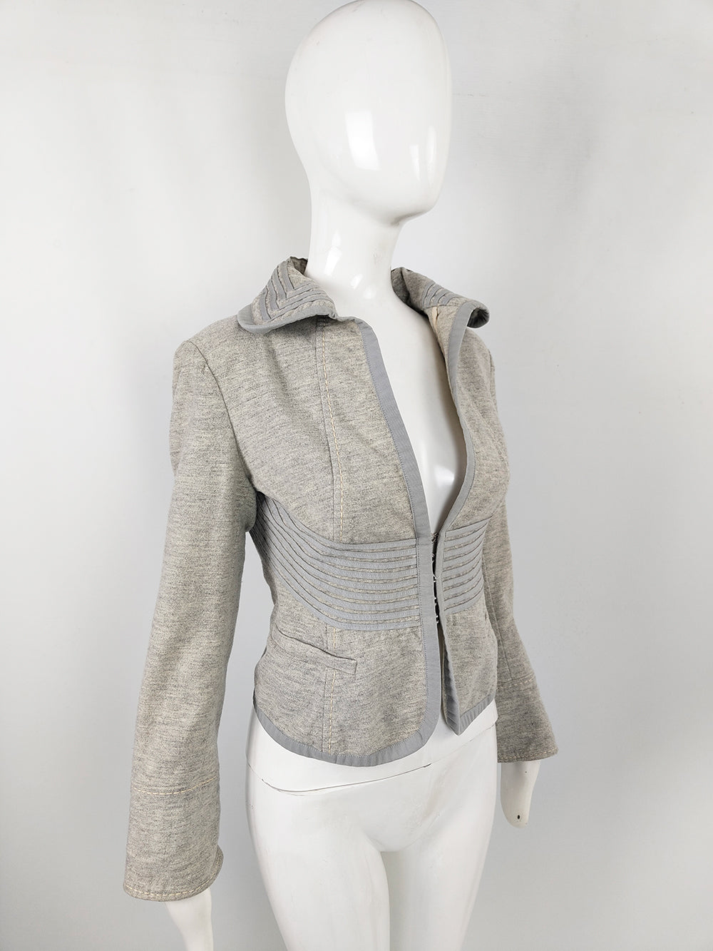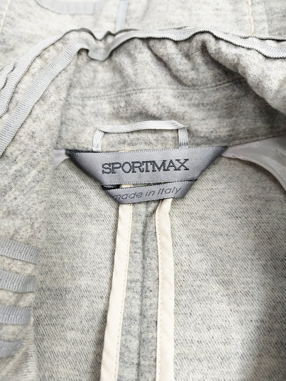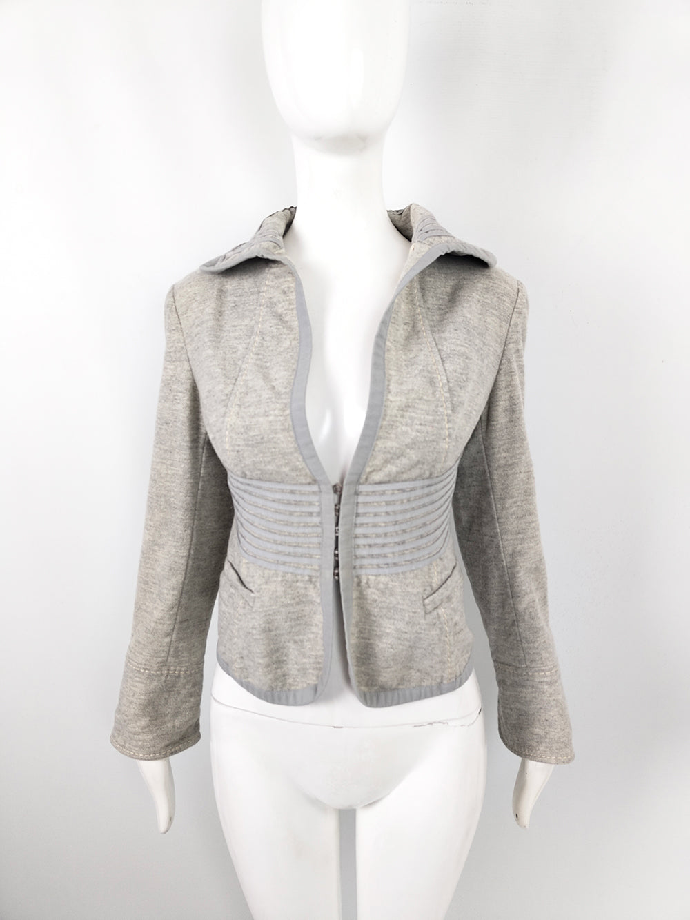 A vintage women’s jacket from the 2000s by Italian fashion house Max Mara, created for the Sportmax line. Made from grey virgin wool with a marled texture, it features a nipped waist and collar trimmed in grey grosgrain ribbon. The ribbon detail continues beneath the bust, creating a flattering, cinched silhouette.