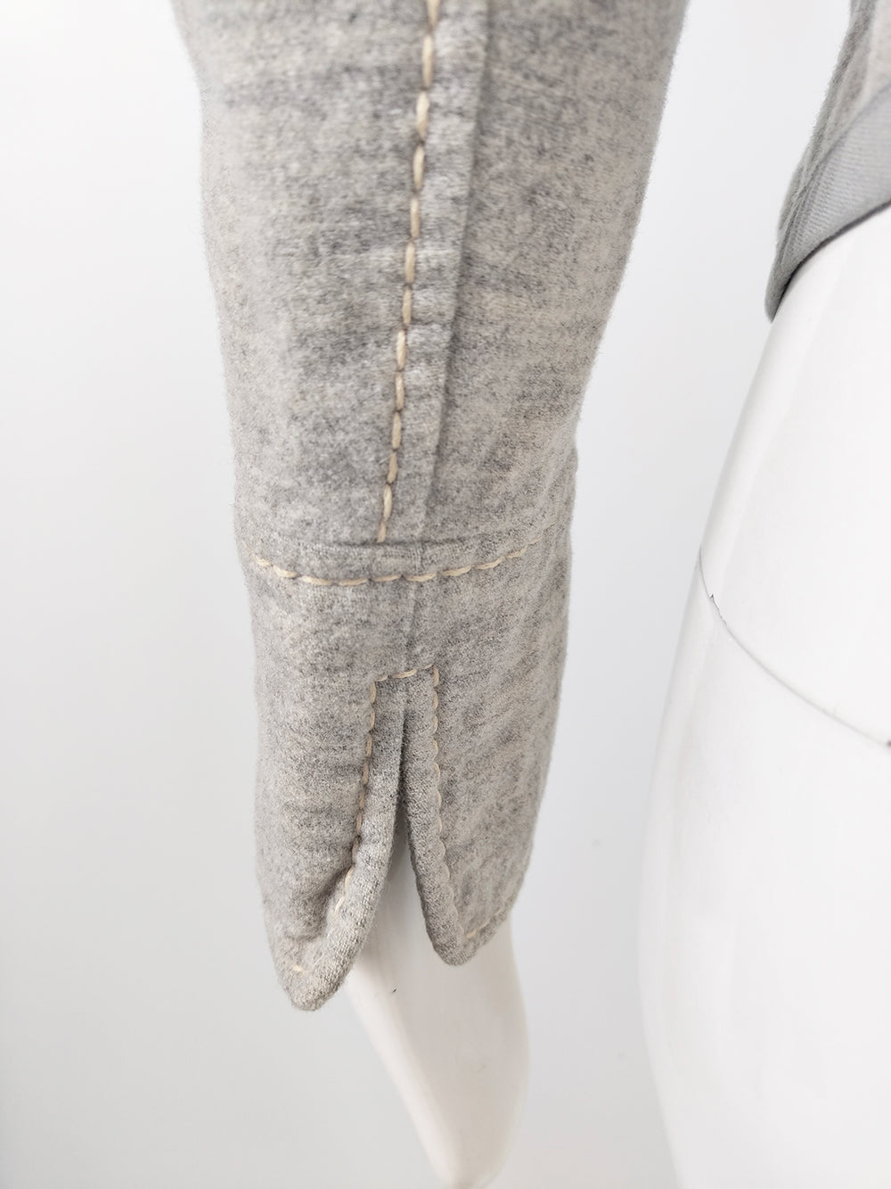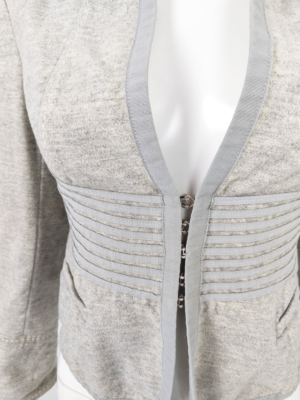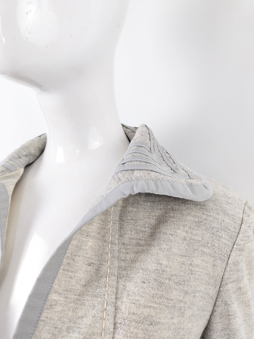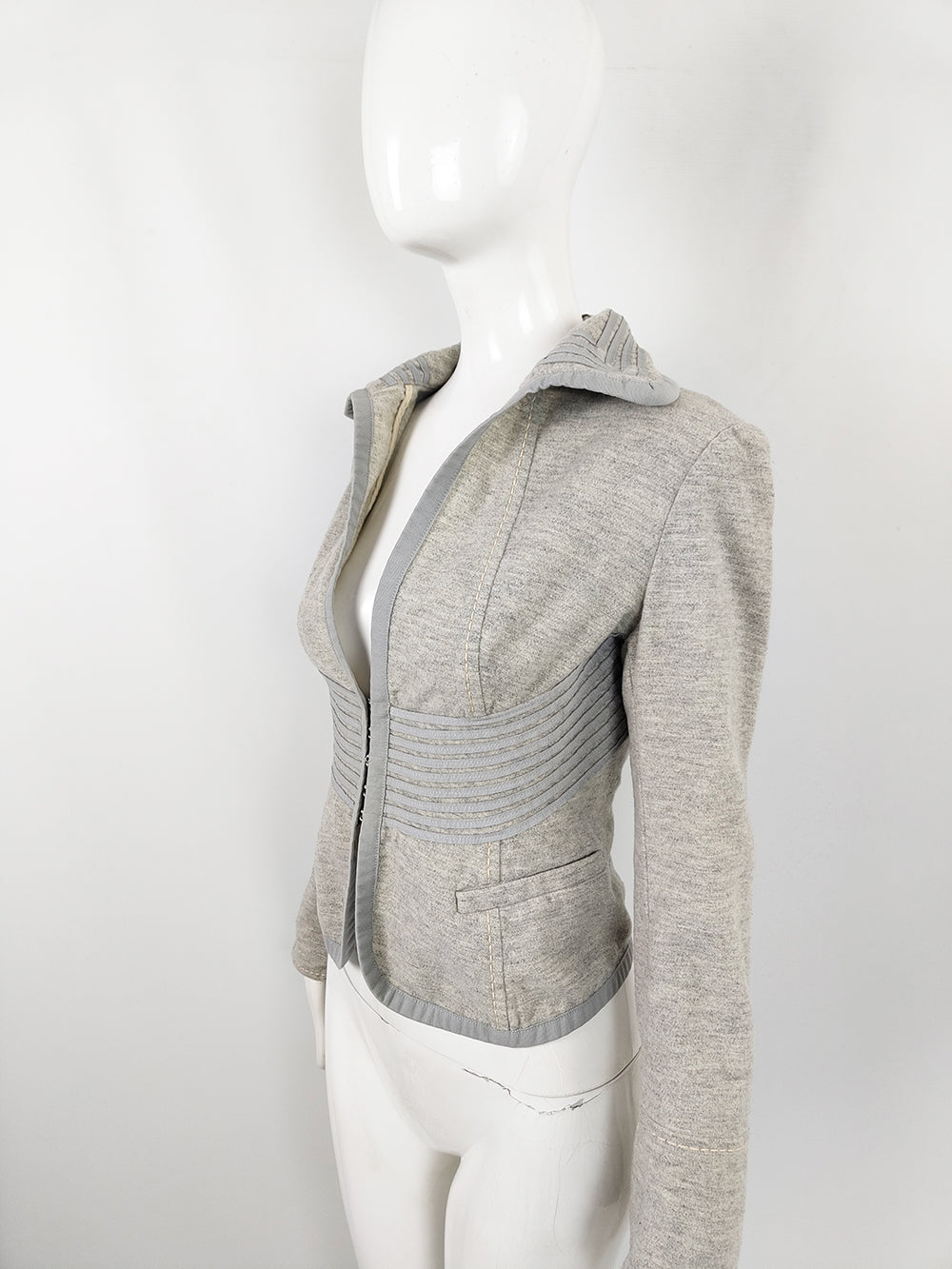 A vintage women’s jacket from the 2000s by Italian fashion house Max Mara, created for the Sportmax line. Made from grey virgin wool with a marled texture, it features a nipped waist and collar trimmed in grey grosgrain ribbon. The ribbon detail continues beneath the bust, creating a flattering, cinched silhouette.