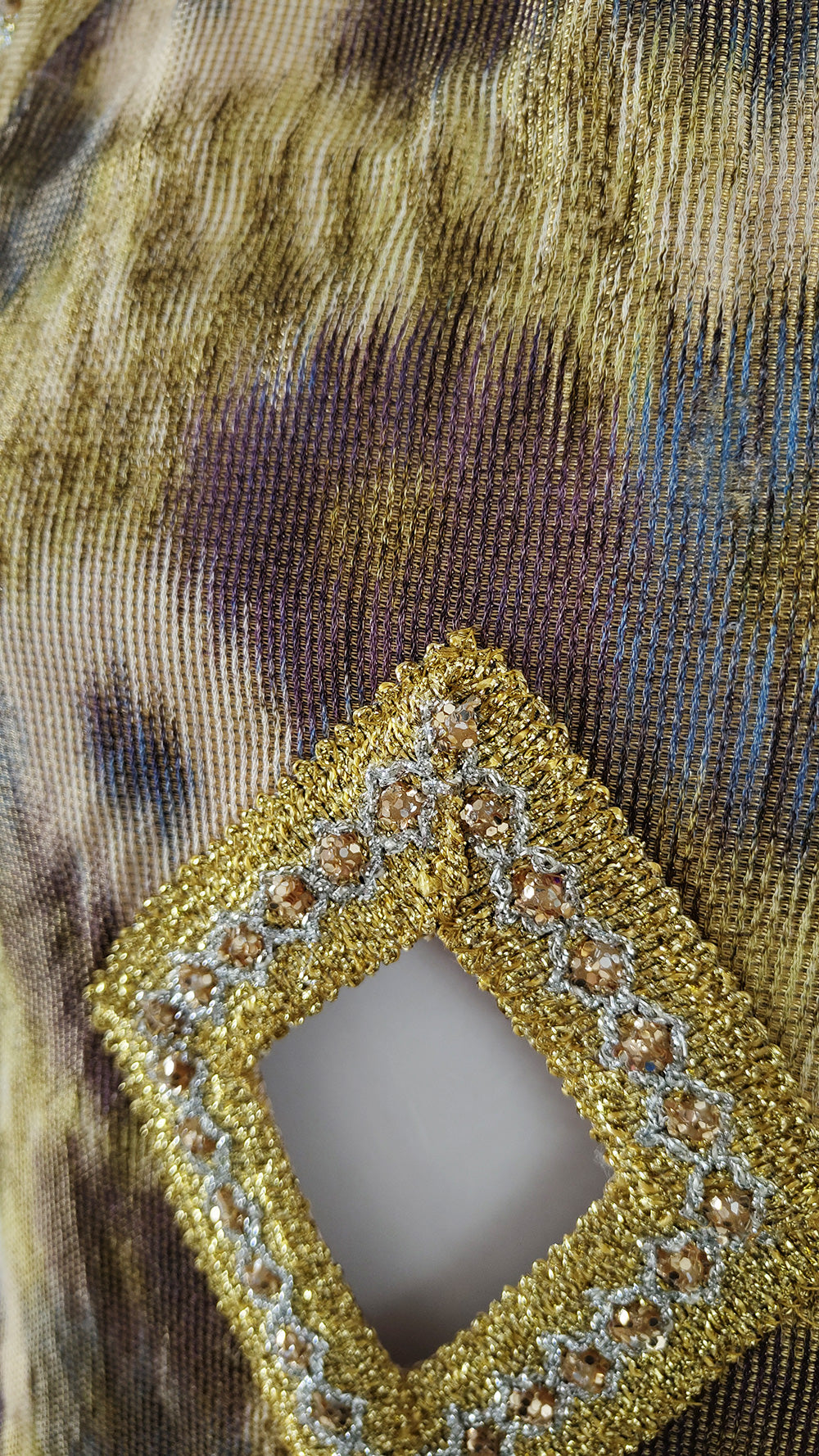 Materials: Unlabelled; feels like acetate or similar with gold lurex trim.