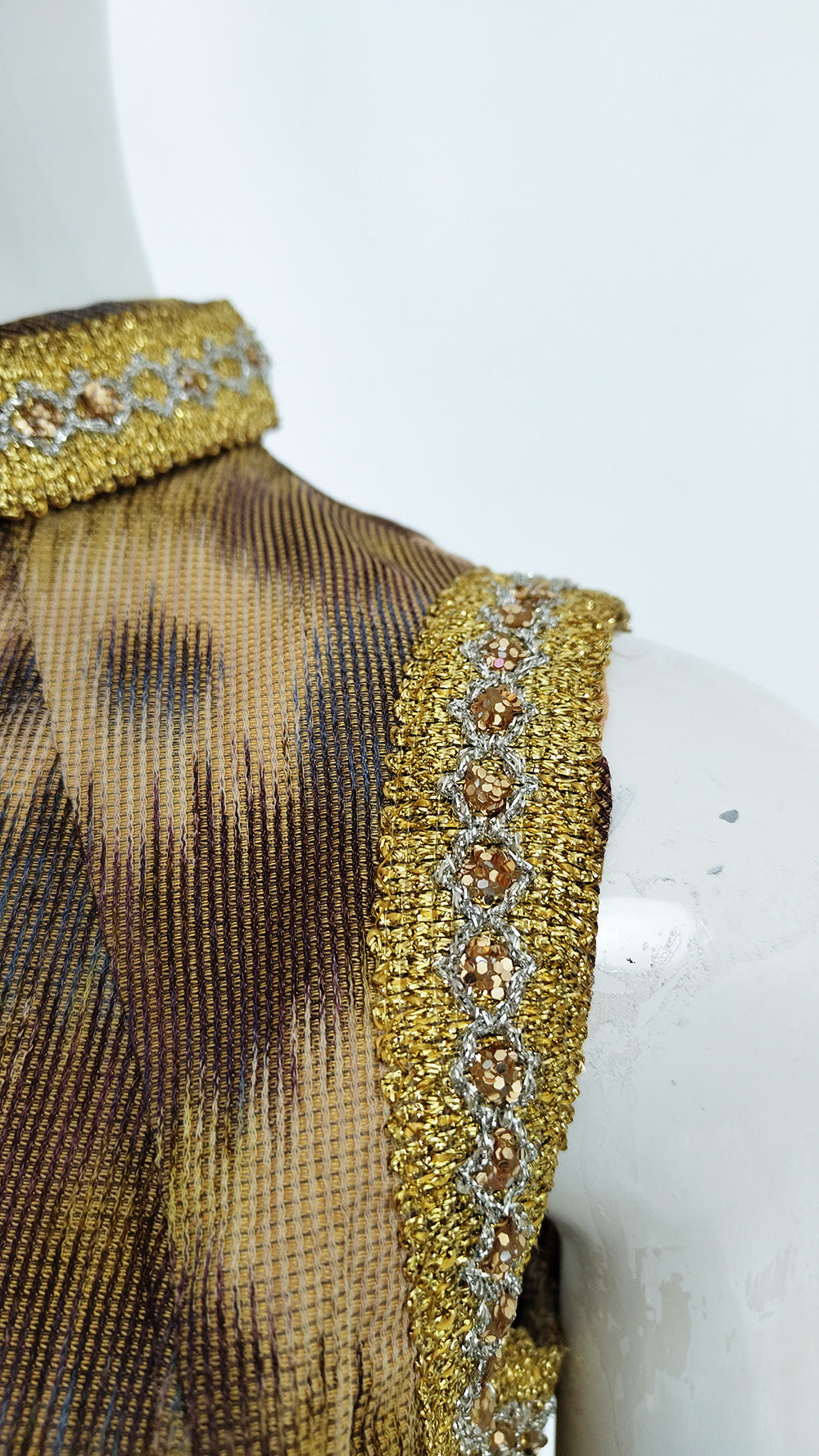 A stunning and rare vintage women's dress from the 60s. In a synthetic woven fabric that gives great structure, and has an Ikat style pattern woven throughout. The sleeveless armholes and mock neck are trimmed with a gold and silver lurex which is then embellished with bronze sequins for an opulent look. The silhouette is A line with a cut out to the centre adding a playful touch.