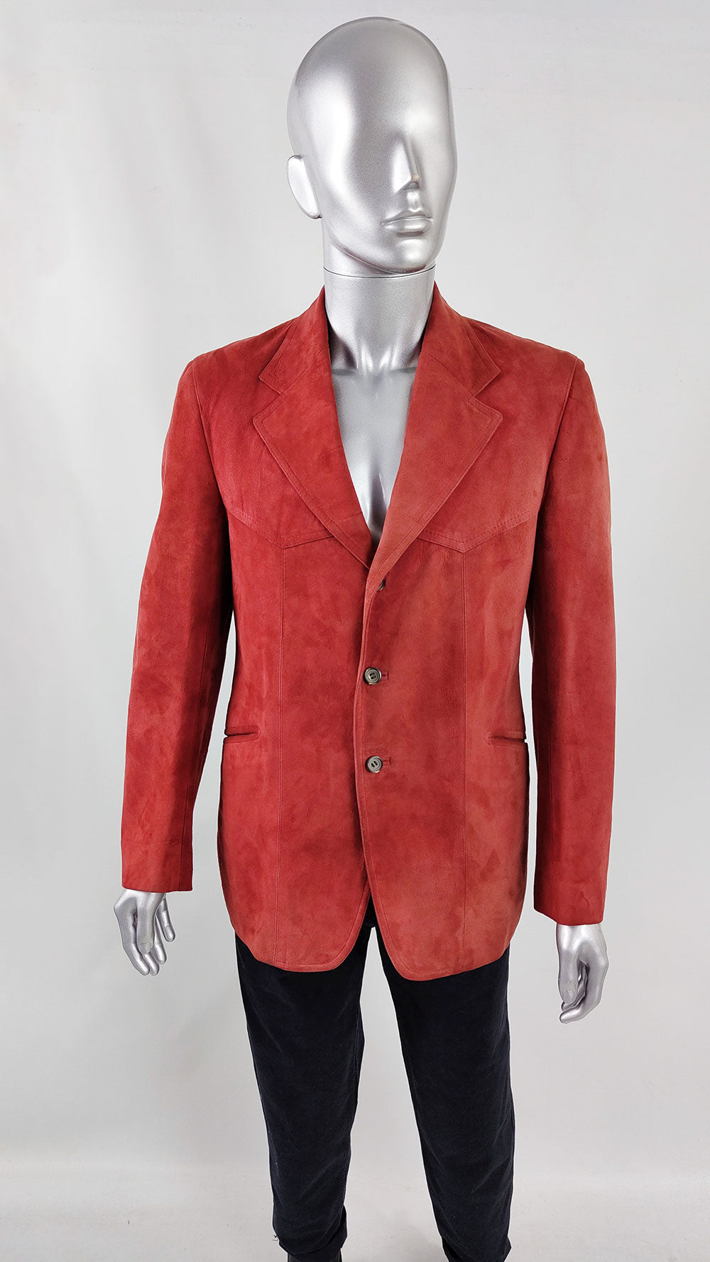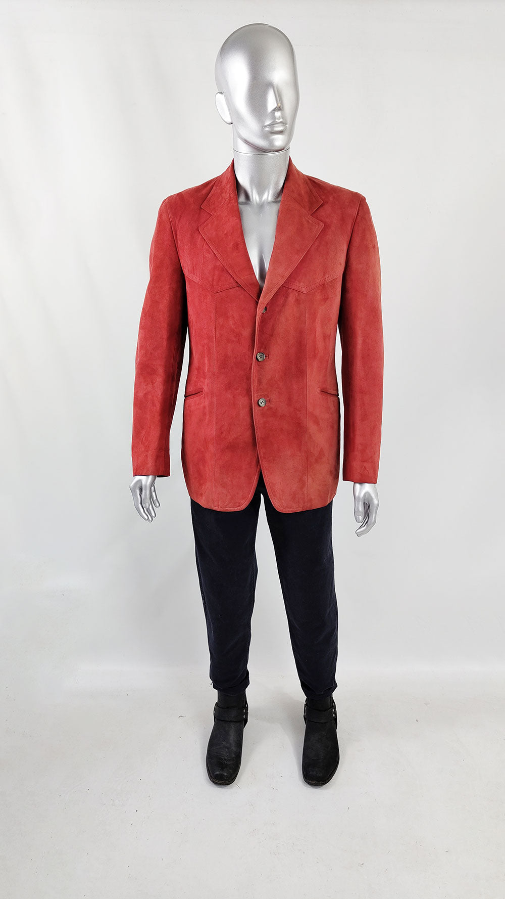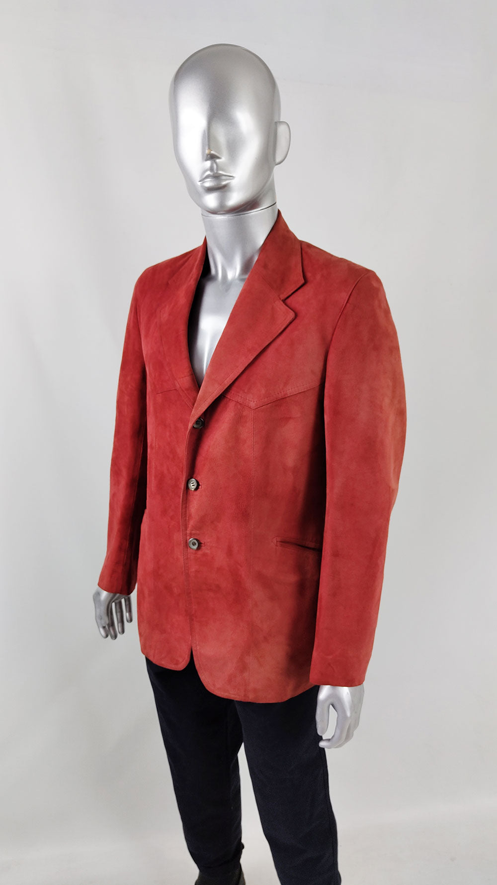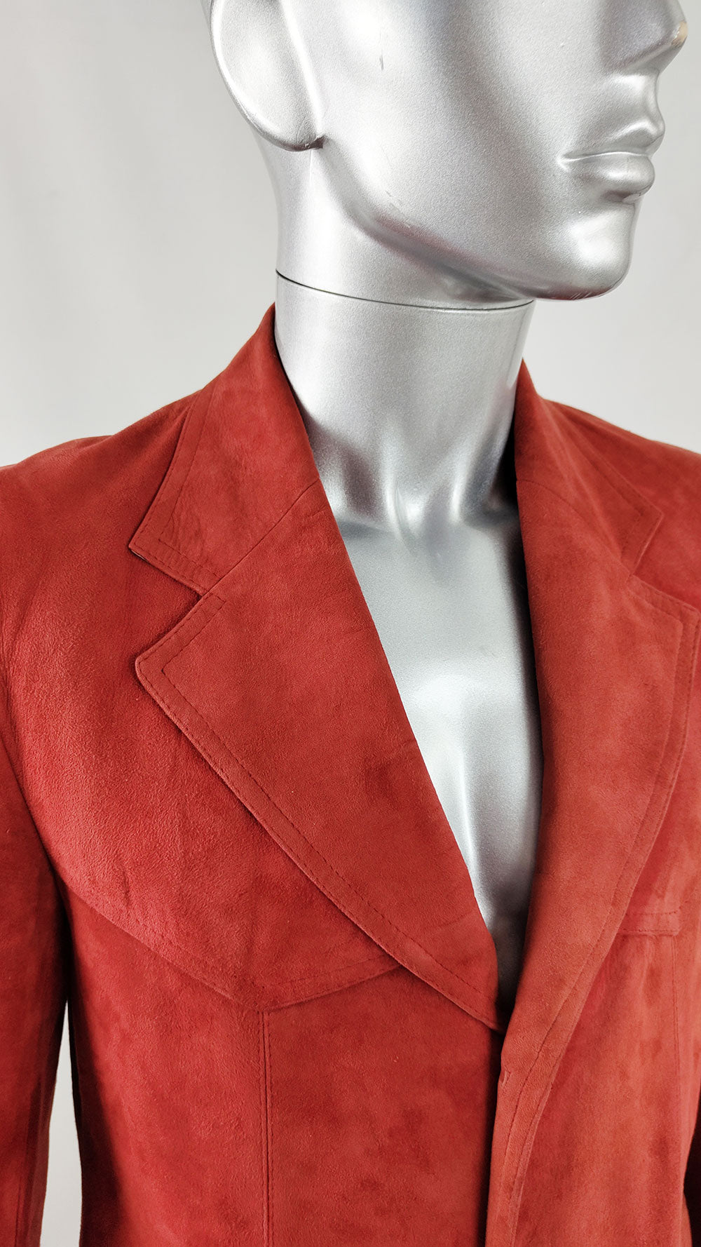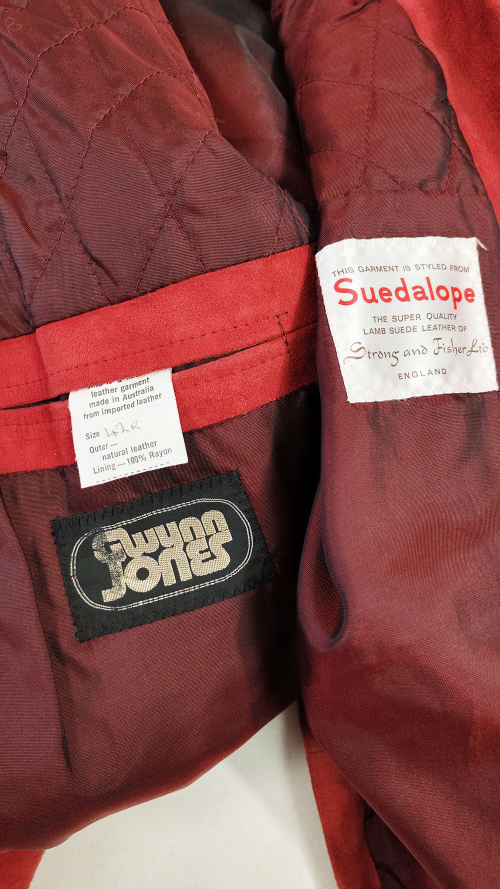 An extraordinary and rare mens vintage jacket from the 1970s by Gwynn Jones, a quality Australian label. Crafted from a British lambskin suede in a vibrant red hue, the blazer features single breasted buttons, classic notched lapels, and a distinctive pointed yoke.