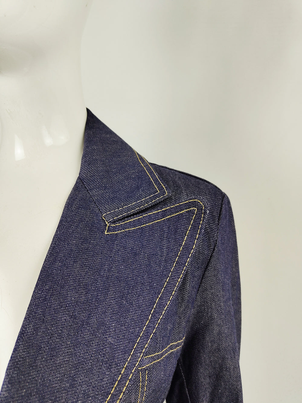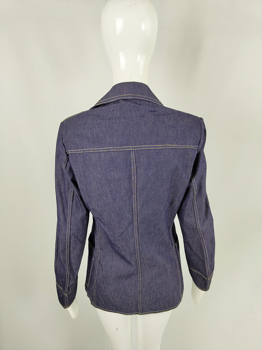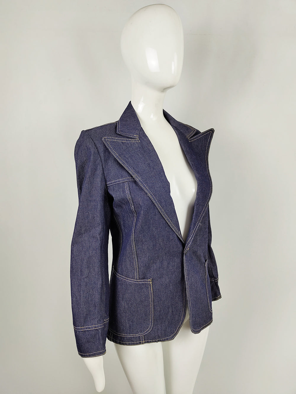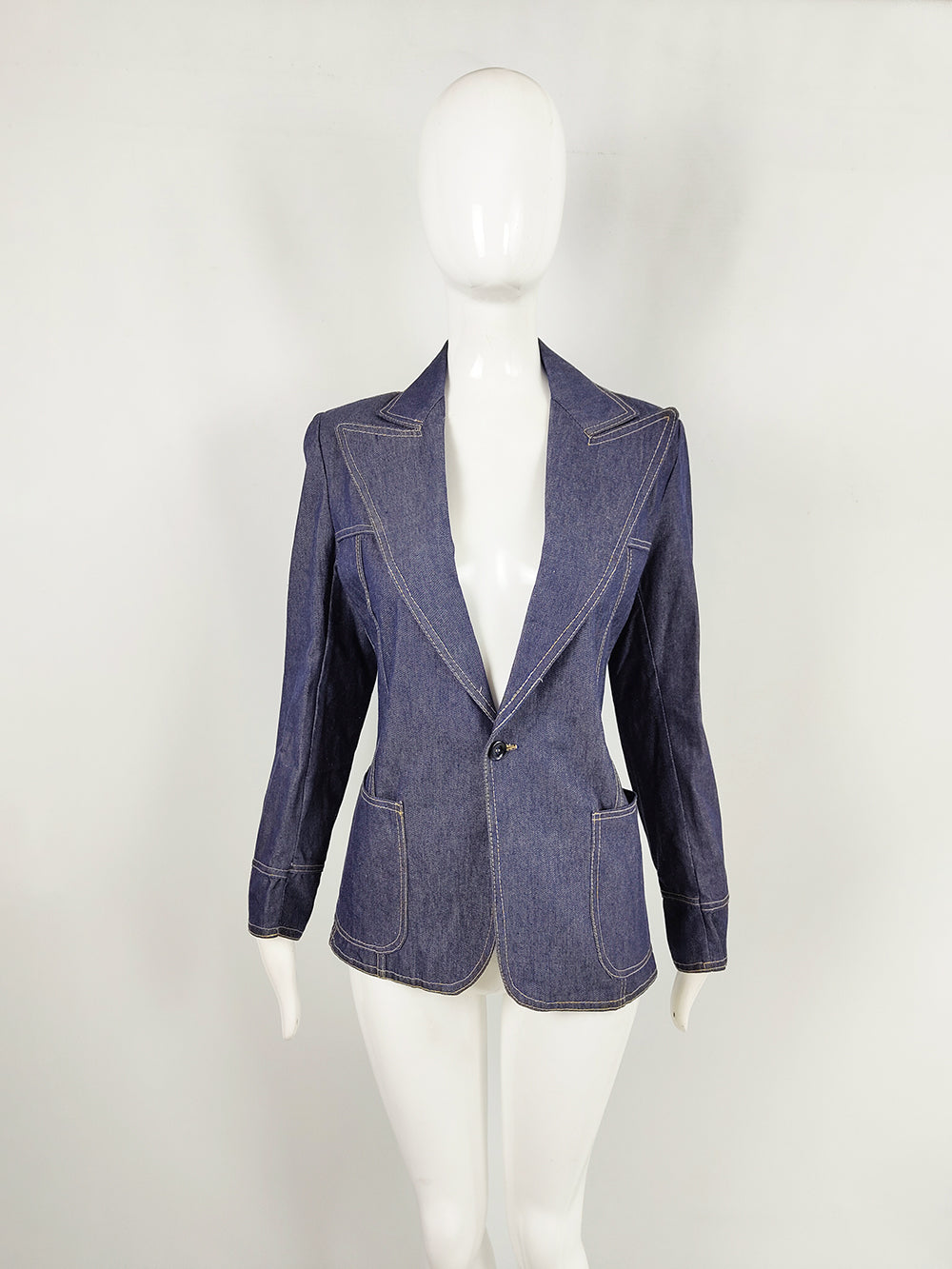 A vintage denim jacket from the 1970s, originally designed for men but with proportions that now suit women especially well. Made from indigo cotton denim with white topstitching, it features peak lapels, patch pockets, and a tapered waist that gives the style a tailored, blazer-like silhouette.