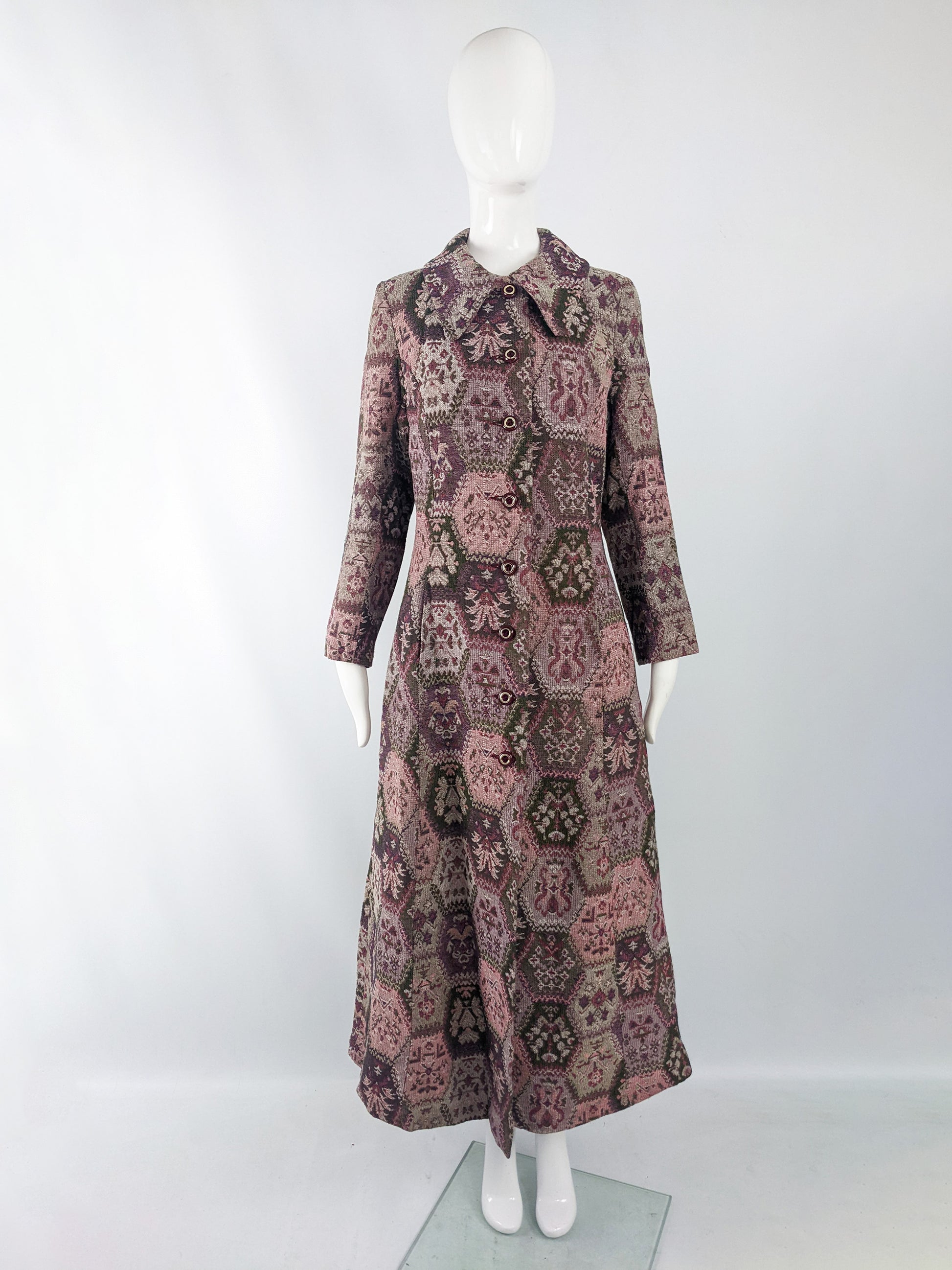 An incredible and rare vintage womens maxi coat from the late 60s / early 70s. In a beautiful tapestry fabric with a rounded collar and a long, column like cut - making the most of the wonderful fabric.